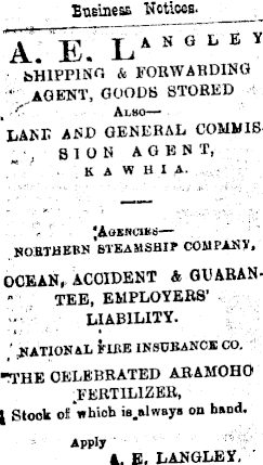 Business Notices. aTeTl a n g le y ' shipping & forwarding AGENT, GOODS STORED LAKE AfiD GENERAL COMMIS--8I O N ADEN T, K A W H I A. "AolSHCiaS — nobthbbn steamship company, OCEAN, ACCIDENT & GUARANTEE, EMPLOYERS’ LIABILITY. NATIONAL Lire insurance co. tthe CELEBRATED ARAMOHO FERTILIZER, | Stock of which ia.alwaya on band. Apply A, E. LANGLEY.