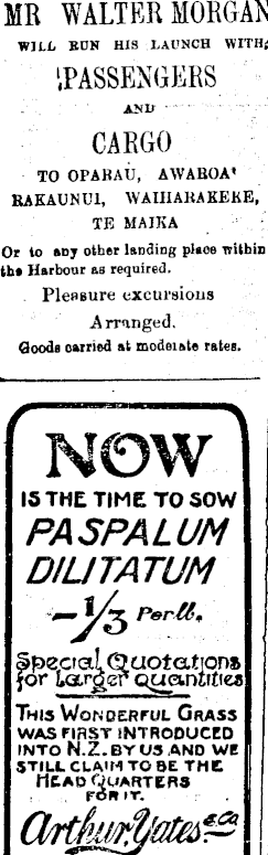 MR WALTER MORGAN WILL. RON HIS LAUNCH WITH; ‘PASSENGERS AND CARGO TO OI’ABAU, AWABOA' RAKAUNUI, WAIHABAKEKE, TE MAIKA Or to any other landing piece within the Harbour ae required. Pleasure excursions Arranged. Goods carried at model ate rates. IS THE TIME TO SOW PASPALUM DILITATUM Per l6 r Special Quotations for Larger ouantitiea This Wonderful Grass WAS FIRST INTRODUCED i INTO N.Z. BY US AND Wt STILL CLAIM TO BE THE Headquarters