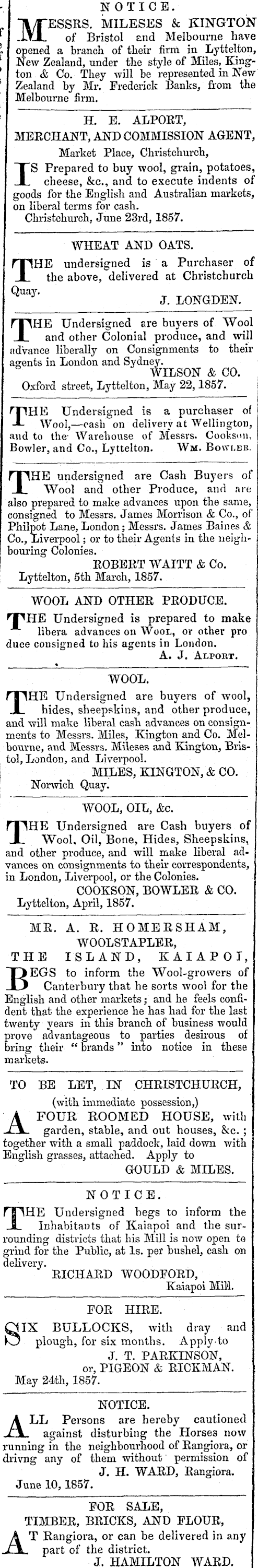 NOTICE. MESSRS. MILESES & KINGTON of Bristol and Melbourne have opened a branch of their firm in Lyttelton, New Zealand, under the style of Miles, Kington & Co. They will be represented in New Zealand by Mr. Frederick Banks, from the Melbourne firm. H. E. ALPORT, MERCHANT, AND COMMISSION AGENT, Market Place, Christchurch, IS Prepared to buy wool, grain, potatoes, cheese, &c, and to execute indents of goods for the English and Australian markets, on liberal terms for cash. Christchurch, June 23rd, 1857. WHEAT AND OATS. THE undersigned is a Purchaser of the above, delivered at Christchurch Quay. J. LONGDEN. THE Undersigned are buyers of Wool and other Colonial produce, and will advance liberally on Consignments to their agents in London and Sydney. WILSON & CO. Oxford street, Lyttelton, May 22,1857. THE Undersigned is a purchaser of Wool, —cash on delivery at Wellington, and to the- Warehouse of Messrs. Cooksoii, Bowler, and Co., Lyttelton. Wm. Bowker. THE undersigned are Cash Buyers of Wool and other Produce, and are also prepared to make advances upon the same, consigned to Messrs. James Morrison & Co., of Philpot Lane, London; Messrs. James Baines & Co., Liverpool; or to their Agents in the neighbouring Colonies. ROBERT WAITT & Co. Lyttelton, sth March, 1857. WOOL AND OTHER PRODUCE. Undersigned is prepared to make libera advances on Wool, or other pro duce consigned to his agents in London. A. J. Alport. WOOL. THE Undersigned are buyers of wool, hides, sheepskins, and other produce, and ■will make liberal cash advances on consignments to Messrs. Miles, Kington and Co. Melbourne, and Messrs. Mileses and Kington, Bristol, London, and Liverpool. | MILES, KINGTON, & CO. Norwich Quay. WOOL, OIL, &c. ; THE Undersigned are Cash buyers of Wool, Oil, Bone, Hides, Sheepskins, and other produce, and will make liberal advances on consignments to their correspondents, in London, Liverpool, or the Colonies. COOKSON, BOWLER & CO. Lyttelton, April, 1857. MR. A. R. HOMERSHAM, WOOLSTAPLER, THE ISLAND, KAIAPOT, BEGS to inform the Wool-growers of Canterbury that he sorts wool for the English and other markets; and he feels confident that the experience he has had for the last twenty years in this branch of business would prove advantageous to parties desirous of bring their " brands" into notice in these markets. TO BE LET, IN CHRISTCHURCH, (with immediate possession,) A FOUR ROOMED HOUSE, with garden, stable, and out houses, &c.; together with a small paddock, laid down with English grasses, attached. Apply to GOULD & MILES. NOTICE. riIHE Undersigned begs to inform the JL Inhabitants of Kaiapoi and the surrounding districts that his Mill is now open to grind for the Public, at Is. per hushel, cash on delivery. RICHARD WOODFORD, Kaiapoi Mill. FOR HIRE. SIX BULLOCKS, with dray and plough, for six months. Applyto J. T. PARKINSON, or, PIGEON & RICKMAN. May 24th, 1857. NOTICE. ALL Persons are hereby cautioned against disturbing the Horses now running in the neighbourhood of Rangiora, or drivng any of them without permission of j J. H. WARD, Rangiora. j June 10, 1857. FOR SALE, TIMBER, BRICKS, AND FLOUR, AT Rangiora, or can be delivered in any part of the district. J. HAMILTON WARD.