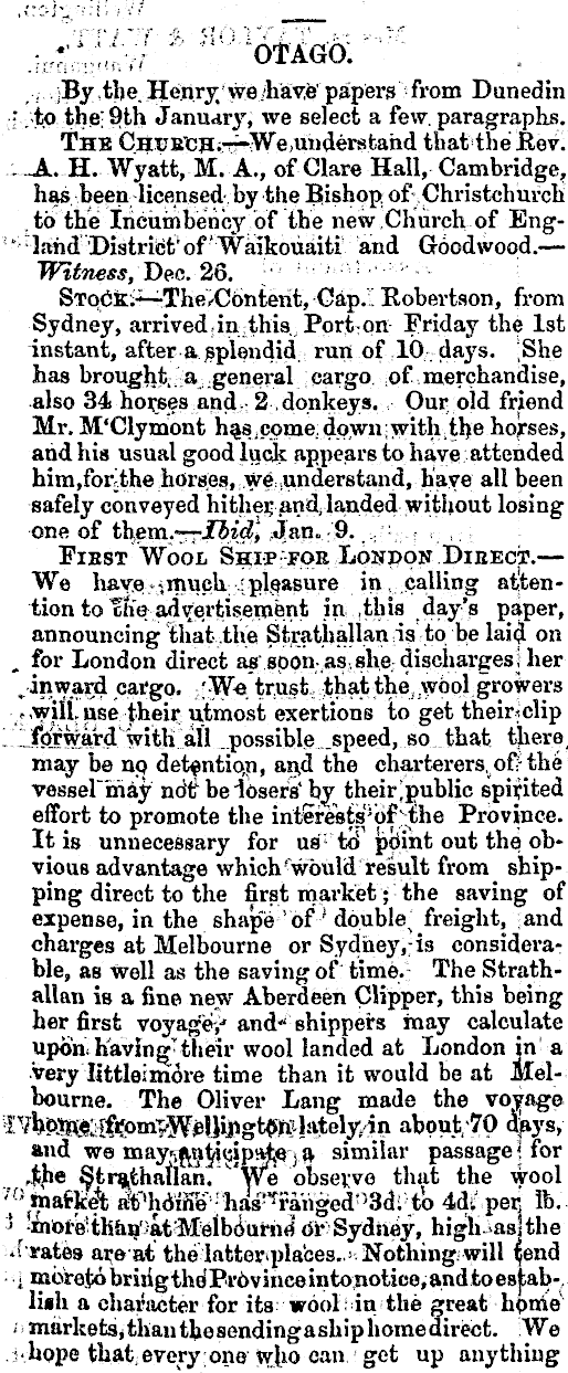• ",, ' OTAGOV By tl)e Henry, we have papers from Dunedin • to the 9th January, we select a few. paragraphs. Thb Chubcp.—We,understahd that the Rev. ..A. H. Wyatt, M. A., of Clare Hall, Cambridge, ha>. been-licensed-by the Bishpp. of .Christchurch ,to the incumbency of the new Church of Eng--3 ":lahd District'of'Waikouaiti and Goodwood.— Witness, Dec. 26. - •- ■ STpCki-KThe>C6nterit, Cap.l Robertson, from Sydney, arrived, in ; this.. Portion Friday the Ist instant, after a splendid, run of .10 days. ,She has brough^a .general cargo, of merchandise, also 34 horses and-2 .donkeys. Our. old friend Mr. M'Clymont has down; with .the horses, and his usual good luck appears to have attended him/oivthe horses, we understand, have all been safely conveyed hither; andj landed without losing one of ;Jan..;'.9.. : , ; ■-. . Fibst Wool Ship -^foe London Dibect.— We h&v,e v ,inuch. ipleasure in, palling attention to Tn'e advertisement in .this day's paper, announcing thaVthe Strathallan is to be lai<j on . for London direct as" spon^as^she; discharges! her cargo. ,'W-a. trust, that the, stbo\ growers f ,wilLase their utmost exertions to get themclip '. l^biward1 with all ..possible ..speed, so_ that. tjiere r may be no, det^ntioji, and the charterers,.of? the vessel'may nor be losers'by their public spirited effort to promote the iriterasts^of;^he Province., It is unnecessary for us: to pdint out the obvious advantage which cwbuld result from shipping direct to the first market; the saving of expense, in the shape'of J double^ freight, and charges at Melbourne or Sydhey,-is considerable, as well as the saving of time.: The Strathallan is a fine new Aberdeen Clipper, this being her first voyaged and* shippers may calculate upon, havlngjtheir wool landed at London in a very littles more time than it would be at Melbourne. The Oliver Lang made the voyage I^6^^oml^^U>»gt^»l4ely f in abput;7o djays, and we may^ni^ip^s,a similar passage', for 4;he Strathaflan.yve observe that the wool '"naafk^t a^hdnW^as^ranged^Sa-to AM per ft..j * mofeithk^^iSteibdurriri dr Sydii^y, high.»asjthe Pirates are at the latterpla'ces.= Nothing will tend ■ i mbretobrijigthePi'bviiiceintonotico.andtoesjbabluh a character for its: wool tan the great hpnie iimarketsithauthesendingashiphomedirect. We .j. hope that; everyone itvho can get up anything