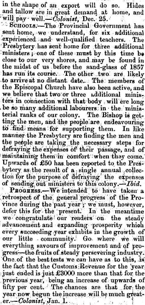 in the shape of wi, export will do so. Hides and tallow are in great demand. at home, and wilj, pay - vretti-^Colonist, Dec- 25. ; :r- Schools:—The Provincial Government has sent home,v we understand, for six additional •experienced j and- well-qualified teachers. The 'Presbytery: has sent home for three additional -ministers ; one of these must by this time be close to our very shores, and may be found in the midst of us before the sand-glaBS of 1857 has run its course. The other .two; are. likely to arrive at no distant; date.. The members of the Episcopal Church have also, been active, and we believe that two: or three additional minis-, ters in connection with that body will ere long .be so many additional labourers in the.'mima-, terial ranks of our colony. The Bishop is getting the men, and "the peopled are, endeavouring to find; means for supporting them. In like manner the Presbytery are finding the men and the people arts taking the .necessary steps; for defraying the e'sfpeiises of their passage, and of 3 maintaining them !ih comfort': when thay come.' Upwards of £50 has been reported to the Preap bytery as the result of a> single annual .collee- ' tion for the purpose of defraying' the expenses of sending, but mim^ters to' this colony ,-^-Ibid. . Phogbess.—-We intended* to' have takeir a ; retrospect of the'J gerieraipriogress ;of tHe Province during the past year •- we must, however, defer this for - the ' present.1 In the meantime we''congratulate* our readers" on the steady advancement and expanding -prosperity whioh every succeeding year exhibits in the growth of' our little - community. Go. where we will everything Bavoursof improvement and of pro-gress^-—the fruits of.steady persevering industry. One. of the best tests we can have as to this, is the fact that the Customs ißevehue for the year just ended is just £3000 more than that for, the previous-year, being an increase of upwards of I fifty per cent. ' The chances are that for; the year now begun the increase will be much g^eat-,et.-r—Colonist, «Tan. .1....,'. : ■ , « '
