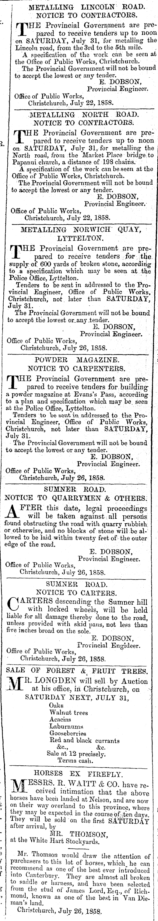 METALLING LINCOLN ROAD. NOTICE TO CONTRACTORS. THE Provincial Government are prepared to receive tenders up to noon on SATURDAY, July 31, for metalling the Lincoln road, from the 3rd to the sth mile. A specification of the work can be seen at the Office of Public Works, Christchurch. The Provincial Govern raeut will not be bound to accept the lowest or any tender. _ E. DOBSON, Provincial Engineer. Office of Public Works, Christchurch, July 22,1858. METALLING NORTH ROAD. NOTICE TO CONTRACTORS: TH B Provincial Government are prepared to receive tenders up to noon on: SATURDAY, July 31, for metalling the North road, from the Market Place bridge to Papatrai- church, a distance of 198 chains. A specification of the work can be seen at the Office of Public Works, Christchurch. The Provincial Government will not be bound to accept the lowest or any tender. E. DOBSON, Provincial Engineer. Office of Public Works, Christchurch, July 22, ISSB. METALLING NORWICH QUAY, LYTTELTON. THE Provincial Government are prepared to receive tenders for thesupply of 600 yards of broken stone, according to a specification which may be seen at the Police Office, Lyttelton. Tenders to be sent in addressed to the Provincial Engineer, Office of Public Works, Christchurch, not later than SATURDAY, July 31. The Provincial Government will not be.bound to accept the lowest or_any .tender. E. DOBSON, Provincial Engineer. Dffice of Public Works, Christchurch, July 26, 1858. POWDER MAGAZINE. " NOTICE TO CARPENTERS. THE Provincial Government are prepared to receive tenders for. building i powder magazine at Evans's Pass, according x> a plan and specification which may be, seen it the Police Office, Lyttelton. Tenders to Toe sent in addressed to the Provincial Engineer, Office of Public Works, Dhristchurch, not later than SATURDAY, July 31. The Provincial Government will not be bound to accept the lowest or any tender. " E. DOBSON, Provincial Engineer. Office of Public Works, Christchurch, July 26, 1858. SUMNER ROAD. NOTICE TO QUARRYMEN & OTHERS. AFTER this date, legal proceedings will be taken against all persons found obstructing the road with quarry rubbish jr otherwise, and no blocks of stone will be allowed to be laid within twenty feet of the outer edge of the road. E. DOBSON, Provincial Engineer. Office of Public Works, Christclmrcb, July 26, 1858. SUMNER ROAD. NOTICE TO CARTERS. /BARTERS descending the Sumner hill \J with locked wheels, will be held liable for all damage thereby done to the road, unless provided with skid pans, not less than five ißches broad on the sole. , E. DOBSON, Provincial Engideer. Office of Public Works, Christchurch, July 26, 1858. SALE OF FOREST & t FRUIT TREES. MR. LONGDEN will sell by Auction at his office, in Christchurch, on - SATURDAY NEXT, JULY 31, ) Oaks Walnut trees Acacias Laburnums Gooseberries Red and black currants &c., &c. Sale at 12 precisely. Terms cash. HORSES EX FIREFLY. MESSRS. R. WAITT & GO. have received intimation that the above horses have been landed at Nelson, and are now • on then- way overland to this province, where they may be expected in the coursebf-;ten days Ihey will be sold on the first SATURDAY after arrival, by iaro MR. THOMSOx^, at the White Hart Stockyards. ■ Mr. Thomson would draw the attention of ' purchasers to this lot of horses, which he can t recommend as one of the best ever introduced into Canterbury. They are almost all broken to saddle or harness, and have been selected r from the stud of James Lord, Esq., of liich- , mond, known as one of the best in Van Dieman s land. Christchureh, July 26, .1858..