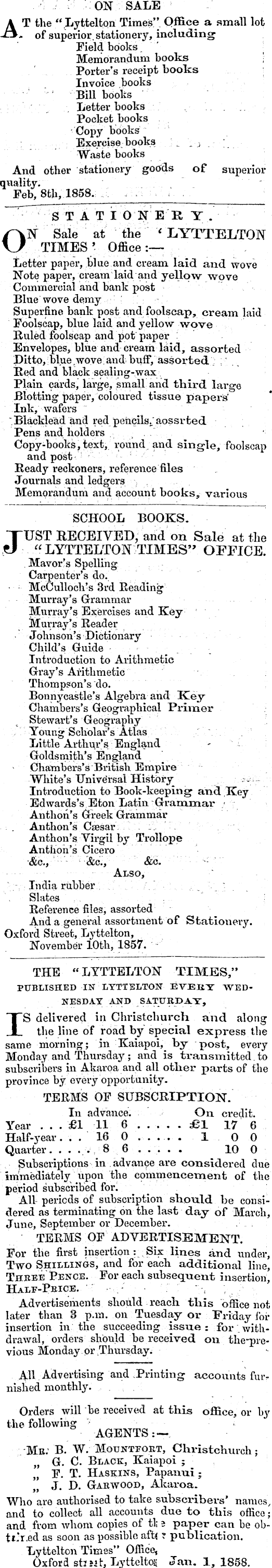 .■'■; ./' ;: ON SALE AT the "Lyttelton Times" Office a small lot - of superior, stationery, including Field books. ' \ Memorandum books \ Porter's receipt books ; Invoice books " Bill books Letter books . '.. . . Pocket books ■ Copy books : Exercise; books ;_ _.; ; Waste books And other stationery gotfds of superior quality. • • - . Feb, Bth, 1858. ..■ STATIONER Y. ON Sale at the '< LYTTELTON TIMES'- Office:— Letter paper, blue and cream, laid and wove Note paper, cream laid and yellow wove Commercial and bank post Blue wove demy ' Superfine bank post and foolscap, cream laid Foolscap, blue laid and yellow wove Ruled foolscap and pot paper : Envelopes, blue and cream laid, assorted Ditto, blue .wove andbuff, assorted ; ; .. Red and black sealing-wax Plain cards, large, small and third large Blotting paper, coloured tissue papers' Ink, wafers "Blacklead and red pencils/aossrted Pens and holders .-..,.-"-..- Copy-books, text, round, and single, foolscap and post [ Ready reckoners, reference files Journals and ledgers % , Memorandum and account books, various SCHOOL BOOKS. JUST RECEIVED, arid on Sale at the ". LYTTELTON TIMES" OFFICE. Mavor!s Spelling Carpenter's do. : McCulloch's 3rd Reading Murray's Grammar Murray's Exercises and Key Murray's Reader • Johnson's Dictionary Child's Guide Introduction to Arithmetic Gray's Arithmetic Thompson's do. Bonnyeastle's Algebra and Key Chambers's Geographical Prinaer Stewart's Geography Young Scholar's Atlas : V Little Arthur's England - ; Goldsmith's England Chambers's British Empire White's TJnive'rsal History .^ : Introduction to Book-keeping and Key Edwards's Eton Latin-Grammar • Anthon's Greek Grammar . : . Anthon's Csßsar. . : - Anthon?s Virgil by Trollope Anthon's Cicero •&c, •"■■'-' v <fee:, : &c. --■■" Also, ; India rubber; \" ... _ ' Slates ' : . : ' Reference files, assorted And a general assortment of Stationery. Oxford Street, Lyttelton, November 10th, 1857. THE "LYTTELTON TIMES," PUBLISHED IN LYTTELTON EVEBT WEDNESDAY AND SATURDAY, IS delivered in Christchurch and along the line of road by special express the same morning; in Kaiapov by post, every Monday and Thursday; and is transmitted. to subscribers in Akaroa and all other parts of the province by every opportunity. TERMS OF SUBSCRIPTION. In advance. On. credit. Year ... £1 11 6 ..... £1 17 6 Half-year. . .16 0 . . 10 0 Quarter. . . ..,86 ..... 10 0 Subscriptions in . advance are considered due immediately upon the commencement of the period subscribed for. # . All periods of subscription should be considered as terminating on the last day of March, June, September or December. . . TERMS OF ADVERTISEMENT. For the first insertion: Six lines and under, Two Shillings, and for each additional line, Thbee' Pence. For each subsequent insertion, Half-Pbice. ,: ; -;-, ; Advertisements should reach this office not later than 3 p.m. on Tuesday or Friday for insertion in the succeeding issue : for withdrawal, orders should be received on the-pre-vious Monday pivThursdayy AH Advertising and accounts fur? nished monthly. Orders will be received at this oflfice, or by the following ■ AGENTS: — •Me: B. W. Mountfort, Christchurch; „ G. C. Black, Kaiapoi ; F. T. Haskins, Papanui; '„ J. D. Gakwood, Akaroa. Who are authorised to take subscribei-s' names, and to collect all accounts due to this office; and from whom copies of tl; i paper can be obtr.'r.ed as soon as possible aft< ? publication. Lyttelton Times" Office, Oxford shut, Lytteltoii Jan. 1, 1858.