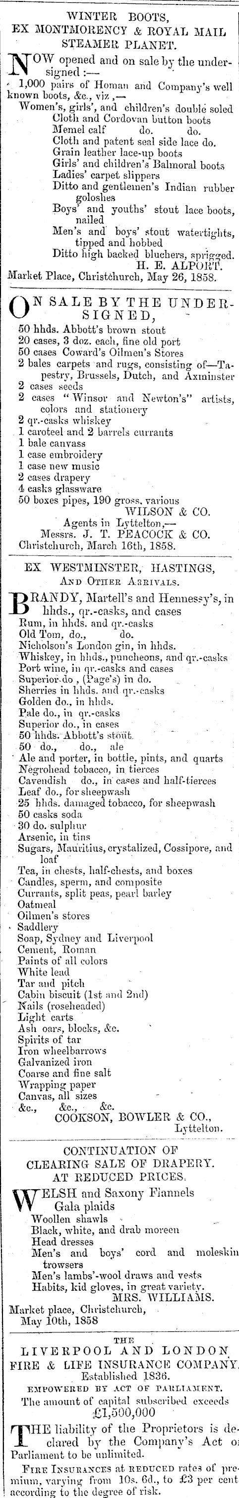 WINTER BOOTS, EX MONTMORENCY & ROYAL MAIL STEAMER PLANET. "jVTOW opened and on sale by the under--L1 signed :— * 1,000 pairs of Hormm and Company's well known boots, &c, viz ,— Women's, girls', and children's double soled Cloth and Cordovan button boots Memel calf do. do. Cloth and patent seal side lace do. Grain leather lace-up boots Girls' and children's Balmoral boots Ladies' carpet slippers Ditto and gentlemen's Indian rubber goloshes Boys' and youths' stout lace boots, nailed Men's and' boys' stout watertights, tipped and hobbed Ditto High backed bluchers, sprigged. H. E. ALPOUT. Market Place, Christchurch, May 26, 1858. ON SALE BY THE UNDER- i SIGNED, - | 50 hhds. Abbott's brown stout j 20 cases, 3 doz. each, fine old port 50 case 3 Coward's Oilmen's Stores 2 bales carpets and rugs, consisting of—Tapestry, Brussels, Dutch, and Axminster 2 cases seeds 2 cases " Winsor and Newton's" artists, colors and stationery 2 qr.-casks whiskey . 1 caroteel and 2 barrels currants 1 bale canvass 1 case embroidery 1 case new music 2 cases drapery 4 casks glassware 50 boxes pipes, 190 gross, various WILSON & CO. Agents in Lyttelton,— Messrs. J. T. PEACOCK & CO. Christchurch, March 16th, 1858. EX WESTMINSTER, HASTINGS, And Otiier Arrivals. BRANDY, Martell's and Hennessy's, in hhds., qr.-casks, and cases Bum, in hhds. and qr.-casks Old Tom, do., do. Nicholson's London gin, in hhds. Whiskey, in hhds., puncheons, and'qr.-casks Port wine, in qr.-casks and cases Superior-do , (Page's) in do. Sherries in hhds. and qr.-casks Golden do., in hhds. Pale do., in qr.-casks Superior do., in cases 50 hhds. Abbott's■ stout, 50 do., do., ale ' Ale and porter, in bottle, pints, and quarts I Negrohead tobacco, in tierces i Cavendish do., in'eases and half-tierces Leaf do., for sheepwash 25 hhds. damaged tobacco, for sheepwash 50 casks soda 30 do. sulphur . ; Arsenic, in tins Sugars, Mauritius, crystalized, Cossipore, and loaf j Tea, in chests, half-chests, and boxes j Candles, sperm, and composite j Currants, split peas, pearl barley i Oatmeal Oilmen's stores • Saddlery Soap, Sydney and Liverpool Cement, Bom an Paints of all colors White lead Tar and pitch Cabin biscuit (Ist and 2nd) In ails (roseheaded) Light carts Ash oars, blocks, &c. Spirits of tar Iron wheelbarrows Galvanized iron Coarse and fine salt Wrapping paper Canvas, all sizes &c, &c, &c. COOKSON, BOWLER & CO., Lyttelton. CONTINUATION OF CLEABING SALE OP DRAPERY. AT REDUCED PRICES, WELSH and Saxony Fiannels Gala plaids Woollen shawls - Black, white, and drab moreen Head dresses Men's and boys' cord and moleskin trowsers Men's lambs-wool draws and vests Habits, kid gloves, in great variety. MRS. WILLIAMS. Market place, Christchurch, May 10th, 1858 THE LIVERPOOL AND LONDON FIRE & LIFE INSURANCE COMPANY. Established 1536. EMPOWERED BY ACT OF FAULT AM ENT. The amount of capital subscribed exceeds £1,500,000 nnHE liability of the Proprietors is deJL clarecl by tbe Company's Act of Parliament to be unlimited. Fire Insurances at reduced rate? of premium, varying from 10s. 6d., to £3 per cent, according to the degree of risk.