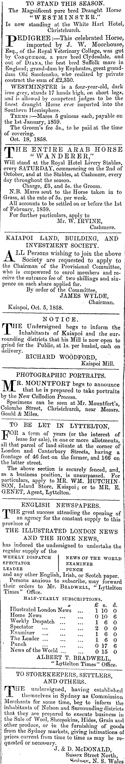 TO STAND THIS SEASON. The Magnificent pure bred Draught Horse "WESTMINSTER." Is now standing at the White Hart Hotel, Christchurch. PEDIGREE :—This celebrated Horse, imported by J. W. Mqorhouse, Esq., of the Royal Veterinary College, was got b\ r Conqoekok, a pure bred Clydesdale, and out of Dtana. the best bred Suffolk mare in England; grand-dam by Euphrates, great grauddam Old Smolensko, who realized by private contract the sum of £2,350. WESTMINSTER is a four-year-old, darkiron grey, stands 17 hands high, on short legs, and is allowed by competent judges to be the finest draught Horse ever imported into the Southern Hemisphere. Teems : —Mares 5 guineas each, payable on the Ist January, 1859. The Groom's fee 55., to be paid at the time of covering. Oct. 18, 1858. j HE ENTIRE ARAB HORSE j "WANDERER/ Will stand at the Royal Hotel Livery Stables, every SATURDAY, commencing on the 2nd of October, and at the Stables, at Cashmere, every day throughout the season. Charge, £5, and os. the Groom. N.B. Mares sent to the Horse taken in to Grass, at the rate of ss. per week. All accounts to be settled on or before the Ist of February, 1559. For further particulars, apply to Mr. W. IRVINE, Cashmere. KAIAPOI LAND, BUILDING, AN\D INVESTMENT SOCIETY. ALL Persons wishing to join the above Society are requested to apply to the Chairman of the Provisional Committee, who is empowered to enrol members and receive the entrance fee of two shillings and sispence on each share applied for. By order of the Committee, JAMES WYLDE, Chairman. Kaiapoi, Oct. 5, 1858. NOTICE. THE Undersigned begs to inform the Inhabitants of Kaiapoi and the surrounding districts that his Mill is now open to grind for the Public, at Is. per bushel, cash on delivery. - RICHARD WOODFORD, Kaiapoi Mill. PHOTOGRAPHIC PORTRAITS. MR. MOUNTFORT begs to announce that he is prepared to take portraits by the New Collodion Process. Specimens can be seen at Mr. Mountfort's, Colombo Street, Christchurch, near Messrs. Gould & Miles. TO BE LET IN LYTTELTON, "OOR a term of years (or the interest of -*- lease for sale), in one or more allotments, all that parcel of land situate at the corner of London and Canterbury Streets, having a frontage of 46 feet on the former, and 166 on the latter street. The above section is securely fenced, and, as a business position, is unsurpassed. For particulars, apply to MR. WM. HUTCHINSON, Island Store, Kaiapoi: or to MR. E GENET, Agent, Lytteltont ENGLISH NEWSPAPERS. nHHE great success attending the opening of J- # an agency for the constant supply to this province of THE ILLUSTRATED LONDON NEWS AND THE HOME NEWS, has induced the undersigned to undertake the regular supply of the WEEKLY DISPATCH NEWS OF THE WOEXD SPECTATOE EXAMINEE LEADER PUNCH and any other English, Irish, or Scotch paper. Persons anxious to subscribe, may forward their orders to Mr. Beadwell, "Lvttelton Times" Office. HALF-YEARLY SUBSCRIPTIONS. Illustrated London News ... 1 10 0 Home News ... ... 010 6 Weekly Despatch ... ... 160 Spectator ... ... if< 20 0 Examiner ... >-t 16 0 The.Leader ... 16 0 ' Punch '" 017 6 I News of the World ... ... 015 0 ALBERT T. BRADWELL, "Ljttelton Times" Office. TO STOREKEEPERS, SETTLERS, AND OTHERS. THE undersigned, having established themselves.in Sydney as Commission Merchants for some time, beg to inform the inhabitants of Nelson and Surrounding districts that they are prepared to execute business in the Sale of Wool, Sheepskins, Hides, Grain and other produce, or in the furnishing of goods from the Sydney markets, giving intimations of prices current from time to time as may be requested or necessary. j. & d. McDonald, Sussex Street' North, <W«W. N. S. Wales