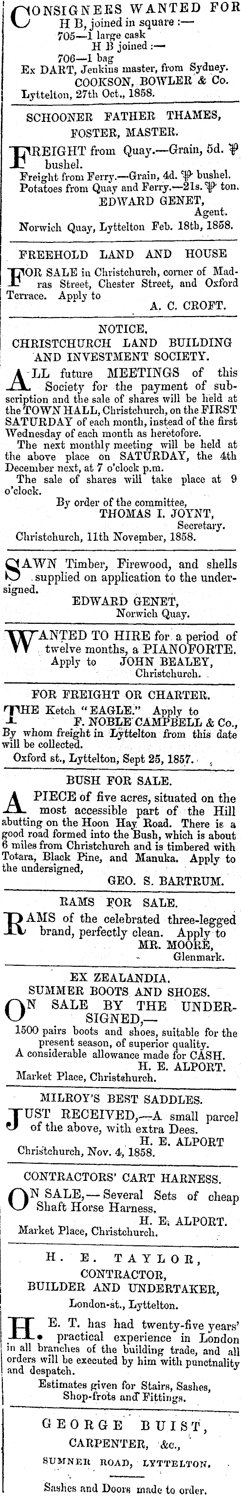 /CONSIGNEES WANTED FOR Kj H B, joined in square : — 705—1 large cask H B joined :— 706—1 bag Ex DART, Jenkins master, from Sydney. COOKSON, BOWLER & Co. Lyttelton, 27th Oct., 1858. SCHOONER FATHER THAMES, FOSTER, MASTER. TT^REIGHT from Quay.—Grain, sd. ty X? bushel. Freight from Ferry.—Grain, 4d. bushel. Potatoes from Quay and Ferry.—2ls. f" ton. EDWARD GENET, Agent. Norwich Quay, Lyttelton Feb. 18th, 1858. FREEHOLD LAND AND HOUSE FOR SALE iv Christchurch, comer of Madras Street, Chester Street, and Oxford Terrace. Apply to A. C. CROFT. NOTICE, CHRISTCHURCH LAND BUILDING AND INVESTMENT SOCIETY. ALL future MEETINGS of tliis Society for the payment of subscription and the sale of shares will be held at the TOWN HALL, Cbristchureh, on the FIRST SATURDAY of each month, instead of the first Wednesday of each month as heretofore. The next monthly meeting will be held at the above place on SATURDAY, the 4th December next, at 7 o'clock p.m. The sale of shares will take place at 9 o'clock. By order of the committee, THOMAS I. JOYNT, ! Secretary. Christchurch, 11th November, 1858. SAWN Timber, Firewood, and shells .supplied on application to the undersigned. EDWARD GENET, Norwich Quay. ; XTTANTED TO HIRE for a period of TT twelve months, a PIANOFORTE. Apply to JOHN^ BEALEY, Christchurch. FOR FREIGHT OR CHARTER. qiHE Ketch "EAGLE." Apply to -i F. NOBLE CAMPBELL & Co., By whom freight in Lyttelton from this date will be collected. Oxford st., Lyttelton, Sept 25,1857. , BUSH FOR SALE. APIECE of five acres, situated on the most accessible part of the Hill abutting on the Hoon Hay Road. There is a good road formed into the Bush, which is about 6 miles from Christchurch and is timbered with Totara, Black Pine, and Manuka. Apply to the undersigned, GEO. S, BARTRUM. RAMS FOR SALE. EAMS of the celebrated three-legged brand, perfectly clean. Apply to MR. MOORE, Glenmark. EX ZEALANDIA. SUMMER BOOTS AND SHOES. ON SALE BY THE UNDERSIGNED,— 1500 pairs boots and shoes, suitable for the present season, of superior quality. A considerable allowance made for CASH. ™ , H- E- ALPORT. Market Place, Christehurch. MILROY'S BEST SADDLES. JUST RECEIVED,—A small parcel of the above, with extra Dees. . H. E. ALPORT Christchurch, Nov. 4, 1858. CONTRACTORS' CART HARNESS. ON SALE,—Several Sets of cheap Shaft Horse Harness, „ , ■ . ' H. Ei ALPORT. Market Place, Christchurch. H.. 'E . TAYLOR, CONTRACTOR, BUILDER AND UNDERTAKER, j ' j London-st., Lyttelton. HE. T. has had twenty-five years' • practical experience in London in all branches of the building trade, and all orders will be executed by him with punctuality and despatch. J Estimates given for Stairs, Sashes, Shop-frote and" Fittings. GEORGE B UIST, CARPENTER, &c, SUMNEIt HOAD, X,YTTELTON. Saslies and Doors made to order.