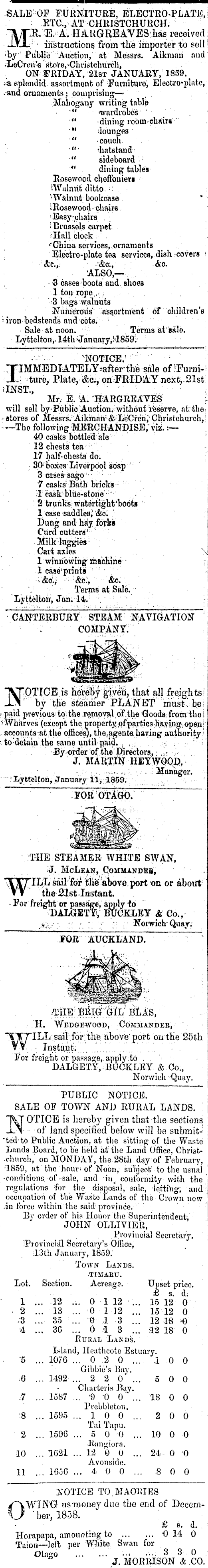 SALE OF FURNITURE, ELECTRO-PLATE, I ETC., AT CHRISTCHURCH. "jl/TR. :E.^A.HAIiGREAVESihas received [ JjjL; instr«ction§ from the importer to selll •by' Public Auction, at Messrs. Ailcman and •LeCren^ store,*Chrisfcchurch, ON FRIDAY, 21st JANUARY, 1859, ;-a splendid, assortment of Furniture, Electro-plate, »and oruamentsj comprising— Mahoganj' writing table '" <wardrobes ' * " dining robin chair* M ilounges " couch i •"' 'hatstand " sideboard : ■*' dining tables Rosewood cheffonien '< Wulnut ditto, •' ; bookcase * j ißosewood-cliairs ! 'Easy chairs ; Brussels carpet. iHall clock: 'China services,,ornaments Electro-plate tea services, dish rcovers i Ac.,: '&c:, &o. ALSO,— . - 3 cases boots! and. shoes 1 ton rope,,;;. •8 bags walnuts Numerous assortment of children's -iron-bodsteads and cots. • Sate at noon. Terms at 'ealo. Lyttelton^ 14th>January,M859i -■••-;■••• ■''NOTICE.1-' ■' • " lIMMEDTATELYiafter the sale of -Furni-; : turey Plate, &c;, on-FRIDiAY nextj-21st: JINST., -•••••'•■..•... Mr. E. A. : r will sell by-Publio Auction; without reserve, at the: ; stores of Messrs. Aikmari;&'Le'Cfe'iv Christchurch,: —The following MERCHANDISE; viz. :— 40 casksbottled ale : 12 chests tea . 17 half-chests do. 30r boxes Liverpool soap' 3 cases-sago ■• 7 casks' Bath bricks ilca"sk;blue-stone :" - : 2 truhkstwate'rtight'booti ' 1 case saddles; <fee. ' IJuiig and hay forks Curd cutters'; Milklnggies; Cart axles .. \ 1 wihribwing machine • :: 1 case'prints ' ' -&ol; -■'&&:, &c.'.. ' Terms at Sale. 'Lyttelton', Jan; 14.: . : ■ ; r ■ CANTERBURY STEAM: NAVIGATION ■••'■■:■■■• COMPANY. : "VTQTTOE is ti^<B% giyeli, that all freights I J3I : by the steanier PLANET must! be; > paid previous; to : the removal of.the Goods, frotnthe j ' Wharves (except the propertj^ Qfpart.ies-hayinsfiope.ni ,accounts-at the offices), the,agents,having authority i •to 'detainthe same untilpaid. 5 ; . ..>; .: > J3y-<)rder,of the Pirectprsj',,- , J. MARTiN HEYWQOD, :....-;_,.,.:-...: Manager. 'lijttelton, January;ilv 1859. v ■•■■••• FOR-otAejp. THE STEAMER WHITE SWAN, ij. McLean, CoMMANDfiB, WILL sail for the! above, port on or aboirt' the 21st-Instant. - For freight or passage,' apply to ' vDALGErfc, BUCKLEY & Go., *i-. :; .' " '■'■ Norwich' Qua/. IQR AUCKLAND. ;BIiIG^i:L'BLAS, H. WeDGEM'OOD, CdKIIANDEB, "\ % TILL sail for'the above port on tHe 25th V : V :: instant.;;;; ;.;.:;....:.;.;;. : : For freight or passage,. apply:td . ' DALGETY, BUCK LEY & Co., Norwich <iuay. PUBLIC NOTICE. SALE OP TOWN AND RURAL LANDS. I^JOTICE is hereby given that the sections -L\ of land specified below will be submit^ *tedto Public Auction, at the sitting of the Waste Lands Board, to be held atthe Land Office, Christchnrch, on MONDAY, the 28th day of February, ■1859, at'the'hour* of Noon,' subject' to the usual -conditions of sale, and in^ conformity with the rfigulation« for the disposal, sale, letting; and: occupation of the Waste Lands o£ the Crown now in force within the said1 province. ' '; ' : " By order of his Honor 'the Superintendent', JOHN OLLIVIER, Provincial Secretary. Secretary's Office, •13tli January, 1859. Town Lands. ■tim-abu. Lot. Section. Acreage. Upset price. £ s. d. 1 ... 12 ... 0 1 12 ... 15 12 0 2 ... 13 ... 0 1 ]2 ... 15 12 0 ;3 ... 35 ... ■■■©■•,1 3 ... 12 IB >0 ■4 ... 36 ... o -1 3 ... aa is o Ruhal Lakds. Island, Ileatheote Estuary. "5 ... 1076 ... 0 .2 0 ... 10 0 Gibbie's Bay. 6 ... 1492 ... 2 2 0" ... 5 0 0 Chiirteris J?ay. ;7 ... 1587 ... '9 0 0 ... 18 0 0 Prebbleton. 8 ... 1595 ... 1 0 0 ... 2 0 0 T;ii Tapu. 2 ... 159G ... 5 0 0 ... 10 0 0 Jiangiora. 30 ... 1(521 ... 12 0 0 ... 24 0 0 Avonside. 11 ... 165G ... 4 0 0 ... 8 0 0 NOTICE TO.JVTAOTJES OA^JNGr us money due the end of December, 1858. £ s. d. . Horapapa, amounting to 0 14 0 Taion—left per Wliite Swan for Otago ... ... ••• ••• 3 3 0 J. MORRISON & CO.