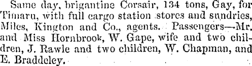 Same day, brigantine Corsair, 134 tons, Gay, for Tiniaru, with full cargo station stores and sundries, Miles, Kington and Co., agents. Passengers—Mr. and Miss ilornbrook, W. Gape, wife and two children, J. Rawle and two children, W. Chapman, and E. Braddeley.