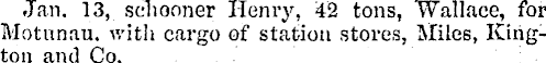 Jan. 13, schooner Henry, 42 tons, Wallace, for Motunau. with cargo of station stores, Miles, Kington and Co. ;