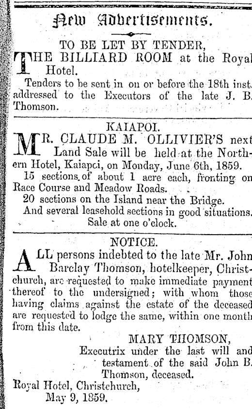 if '. i^nii . M TO BE LETmS 7TENDER, .' JtmHE BILLIARD ROOM at the Royal »JL : Hotel. ■ ,:■;,.;, . .. '..,■,. '• ml Tenders to be sent in on or before sthe 18th inst. m, addressed' to the Executors of the late J. B. || Thomson. . : . :. : .-; ■.■;;..,-"; '■'-:■-'■ '; I ' ~ KAIAPOL I IUTTL CLAUDE M. OLLIVIER'S next 1 ixJL Land Sale will be held, at the NorthI €m Hotel, Kaiapci, on Monday, June 6th, 1859. H 15 sections, of about 1 acre each, fronting on B Race Course and Meadow Roads. ... B 20 sections on the Island near the Bridge. H And several leasehold sections in good situations. H \ Sale at one o'clock. ' I ' ' NOTICE. ~~ " I A LL persons indebted to the late Mr. John I -O_ Barclay Thomson, hotelkeeper, ChristI church, arc-requested to make immediate payment I "thereof to the undersigned; with whom those I having claims. against the estate of the deceased I are requested to lodge the same, within one month I from this date. . . ■ I v MARY THOMSON, I Executrix under the last will and 1 ■ ' testament.of the said John B. I ' Thomson, deceased. I Royal Hotel, Christchureh, I May 9, 1859..