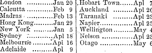 London Jan 20 .Hobart T0wn......Apl 7 Calcutta .......Feb 9 Auckland Apl 26 Madras Feb 13 Taranaki Apl 23 Hong Kong Jan 29 Napier... ...Apl 25 New York Jan 5 ..Wellington May 4 Sydney :........,..Apl 18 Nelson Apl 23 Melbourne "Apl 16 Otago May 6 Adelaide Apl 9