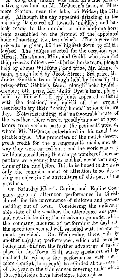 A piougning maien was neia on a nne piece 01 native grass land on Mr. McQueen's farm, at Ellesmere S'ation, near thf lal; e,~ on Friday; the 17th inst. Although the day appeared .drizzling in the morning, if cleared off towards 'midday; and bullock teams, to the number of nine and- one horse team assembled on the ground at' the'appointed hour of starting, viz., ten o'clock. "There were five prizes b"e given, £6 the'highest down tq ; £2tlie lowest^ The judges selected for the\ocea.siqn \yere Messrs. Marshrria'n, Miln, and' Guild, who .awarded the) prizes as follows :—lst prize, horse team, plough held by James Williams |.-2nd pvizej"Mr. Manson's team, plough held by Jacob Street; 3rd prize, My. Jahies/Smith's'team> plough held by himself; 4th prize'/'jyCrs/.Gebbie's team,\plo\igh,' h6ld"by John -G-ebbie; 6th prize, Mi". John Dyer's^ team, plough held by "TiTiSself.""] E?ery' one; appeared satisfied with tl*e decision," and." "rqove'd off. .the....ground resblyed'totry 'their " caiiny tands" "at some future^ day.l; Notwithstanding the-'unfavourable'''state of the weather, 1 there were a 'goodly nunibqi' of spectators from various.parts of the peninsula present, whomi MivM'cQueen entertained in his usual hospitable style. The promoters of the match deserve great" credit for the' arrangements made, and the way they were carried-out; and the work was very welldone,considermg that alavge numberof thecompetitors were young hands and had never seen anything of the hind before. It is to be hoped that this is only the commencement of attention to so deserving an object;in the agriculture of this part of the province. ...■-.•.... 'On Saturday Elaer's Canine, and Equine Com-pany-gave an' afternoon performance in Christchurch for the convenience of children and persons residiug out of town.. Considering the -unfavourable state of the weather, the attendance was good, and notwithstanding the disadvantage under, which the compaivy laboured of performing,by daylight, the spectators, seemed well satisfied with the aiuuseinput...provided. On Wednesday; there..will ty3 another daylidht performance, which will have (or Indies and children the further -advantage of 'tnknu? place, in tho. ;Town ,Y\ .-ill,where spectators will b? enabled .to witness-, the •.performance- with . m«l' n more'comiiii'b.thim.coul.d be ailqrde,d at this seas»i» of the.yi'arjn the tliin canvas covering vn&w wluC' l the .exhibitions.have, heretofore, taken, place