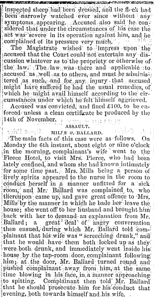 —im iinii ii ii ii in tin himiihiiiii in i iii ii iii iii ii i r ecjjiMrwn. inspected sheep had been dressed, ana" the fleck had been "•narrowly watched ever since without any ' symptoms appearing. Accused also said lie con ; 'sidered that under the circumstances of his case the act was 'severe in its operation against him, and he complained of its pressure very much. '"' The Magistrate wished to 'impress upon tho 'accused that the Court could not entertain any discussion whatever as to the propriety or otherwise of the' law. The law Avas there and applicable 'to • accused as, well as to others, and must be administered ,as such, and for any injury that accused .might' have suffered he had the usual remedies, of jwhich he might avail himself according to Hie circumstances under -which he felt himself aggrieved. Accused was convicted, and fined £100, to be enforced unless a clean certificate be produced by the 14th of November. ASSAULT. MILTS V. BALLARD. The main facts of this case were as follows. On Monday the 6th instant, about eight or nine o'clock ,in the morning, complainant's wife went to the Fleece Hotel, to visit Mrsv. Pierce, who had been lately confined, and whom she had known intimately for some time past. Mrs. Mills behur a person of lively spirits .appeared to the nurse in the room to conduct herself in a manner unfitted for a sick room, and, Mr; Ballard Avas complained to, ay ho thereupon came up, and gave great offence to Mrs. Mills'by the manner in which he bade her' leave the house; she Avent off to her husband and brought him 'back Avith her to demand an explanation from Mr. Ballard; a great I'deal'of angry conversation "then ensued, during which Mr. Ballard told complainant that his Avife Avas " screeching drunk," and that he would have them both locked up as they Uvereboth drunk, and immediately Avent inside his house by the tap-room door, complainant following him; at the door, Mr. Ballard turned round and 'pushed complainant' away from him, at the same time blowing in his face, in a manner approaching 'to spitting. Complainant then told* Mr. Ballard that he shoiild prosecute him for his conduct that both towards himself and his Avife.