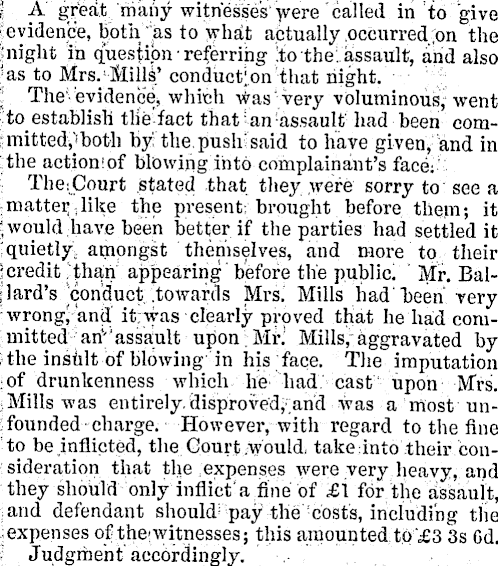 ,' A great many witnesses were called in to give evidence, both as to Avhat actually occurred on the night in question referring to the assault, and also 'as to Mrs. Mills' conduction that night. The evidence, which was very voluminous, Avent :to_ establish tlie'fact that-an Assault' had been corn;;mitteuVboth by the.push? said to have given^'and in ;;the actiomof blc-Aving into complainant's face';' ■ TheiCourt stated that. they, were sorry to see a matter, s like the present; brought before them; it ', would .-have been better if the parties had settled it ;quietly, amongst themselves, and more ' to, their | credit ;thaii appearing before the public. Mr. Ballad's "conduct /towards Mrs.' Mills had "been.'very - Avrongi and it;Avas clearly proved that he had coni- ; mitted ; an*'' assault upon: Mr.! Mills, 1 aggravated by : the insfilt of bknving- in his face. The imputation :of drunkenness which he; had. cast' upon Mrs.' ;.Mills Avas entirely.disproved;;an'd Avas a most un- ; founded charge. However,with regard to the fine ■ to be .inflicted, the Court .would, take dnto their consideration that the expenses were very.heavy,, and they should only inflict'a fine of £\ for the assault, .and defendant shouldl pay the !costs, including the of the* witnesses; this amounted to £3 3s Cd. Judgment accordingly.