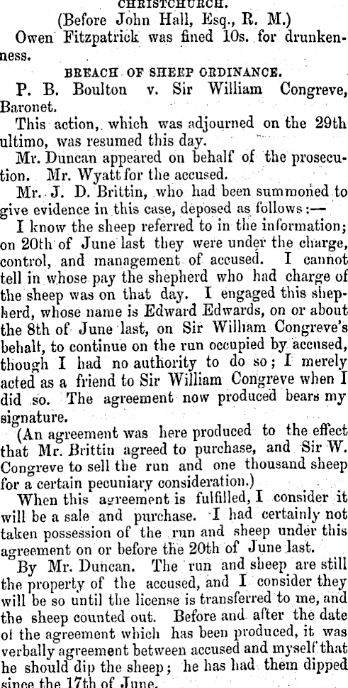 CHEISTCHTTECH. (Before John Hall, Esq., R. M.) Owen Fitzpatrick was fined 10s. for drunkenness. . . BREACH OF SHEEP OBDINANCE. P. B. Boulton v. Sir William Congreve, Baronet. This action,, which was adjourned on the 29fch ultimo, was resumed this day. Mr. Duncan appeared on behalf of the prosecution. Mr. Wyattfor the accused. Mr. J. D. Brittin, who had been summoned to give evidence in this case, deposed as follows:— I know the sheep referred to in the information; on 20th of June last they were under the charge, control, and management of accused. I cannot tell in whose pay the shepherd who had charge of the sheep was on that day. I engaged this shepherd, whose name is Edward Edwards, on or about the Bth of June last, on Sir William Congreve's behatt, to continue on the run occupied by accused, though I had no authority to do so; I merely acted as a friend to Sir William Congreve when I did so. The agreement now produced bears my signature. •■■„ (An agreement was here produced to the effect that Mr. Brittin agreed to purchase, and Sir W. Congreve to sell the run and one thousand sheep for a certain pecuniary consideration.) When this agreement is fulßlled, I consider it will be a sale and purchase. I had certainly not taken possession of the run and sheep under this agreement on or before the 20th of June last. By Mr. Duncan. The run and sheep are still the property of the accused, and I consider they will be so until the license is transferred to me, arid the sheep counted out. Before and- after the date oi the agreement which has been produced, it was verbally agreement between accused and myself" that he should dip the sheep; he has had them dipped since the 17th of June.