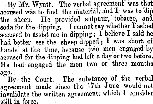 By Mr. Wyatt. The verbal agreement was that accused was to find the material, arid I was to dip the sheep. He provided sulphur, tobacco, and soda for the dipping. I cannot say whether Tasked accused to assist me in dipping; I believe I said he had better see the sheep dipped; I was short of hands at the time, because two men engaged by accused for the dipping had left a day or two before. He had engaged the men two or three months ago. •.■■■■ By the Court. The substance of the verbal agreement made since the 17th June would not invalidate the written agreement; which. I consider still in force.