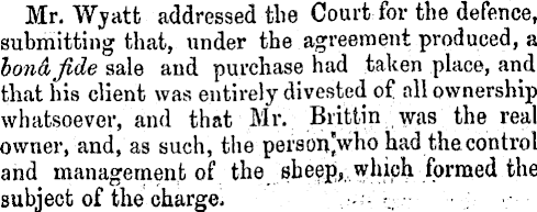 Mr. Wyatt addressed tlie Court for the defence, submitting that, under the agreement produced, a bon&fide sale and purchase had taken place, and that his client was entirely divested of! all ownership whatsoever, and that Mr. Biittin was the real owner, and, as such, the person'who had the control and management of the sheep,,which formed the subject of the charge. -.■■->'-'';;■••