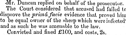 '■Mr. Duncan replied on behalf of the prosecutor. The Court considered that accused had failed to disprove the primtH facie evidence that proved him to be equal owner of the sheep which were infected' and as such he was amenable to the law. Convicted and fined £100, and costs, 2s.