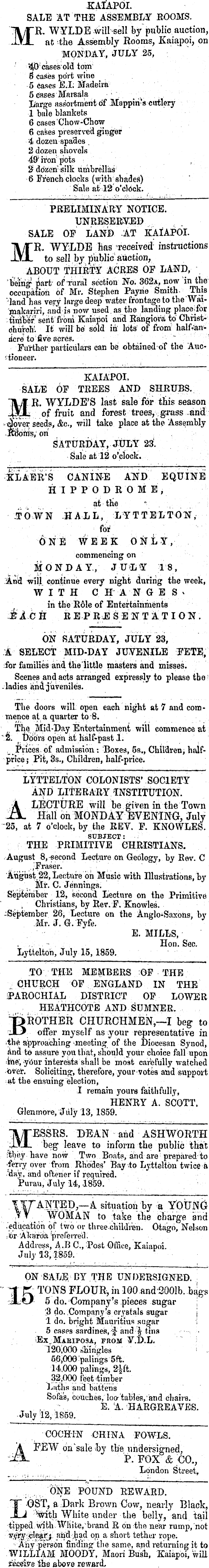 &AIAPOI. SALE "AT THE ASSEMBLY ROOMS. MR. WYLDE will sell by public auction, at the Assembly Rooms, Kaiapoi, on MONDAY, JULY 25, <5|»0; cases'old torn # cases port wine 5 cases E.I; Madeira 5 Cases Marsala ' ■;..'■ Large assortment of Mappiris cutlery 1 bale blankets 6 cases Chow-Chow 6 cases preserved ginger 4 dozen spades . 2 dozen shovels 49' iron pots : r 5 dozen1 silk umbrellas 6 French clocks (with shades) Sale at 12 o'clock. PRELIMINARY NOTICE. UNRESERVED SALE OF LAN© -AT KAIAPOI. MR. WYLDE Has deceived instructions to sell by public auction, ABOUT THIRTY ACRES OF LAND, 'feeingl pW of-rural section No. 362 a, now in the occupation of Mr. Stephen Pajiie Smith- This "land has very large deep water frontage to the'Wai'makariri, and is dow used, as the landing placeiior tinibe'r serif from Kaiapoi and Rangiora to' Christdhurohl It wilt be' sold in' lots' of from halfcmricre to five acres. Further particulars can be obtained of the Auctioneer. KAIAPOI. SALE OF TREES AND SHRUBS. MR. WYLDE'S last sale For this season of fruit and forest trees, ; grass -and -clover seeds, Ac, will take place at the Assembly x&Jrinis/ori SATURDAY, JULY 23L Sale at 12 o'clock. KLAER'S CANINE AND EQUINE HIPPODROME, , at the "■■ . ;..' \ TOWN MALL, LYTTELTON, for ONE WEEK ONLY, commencing on MON D A V-, JU&*Y 18, .'Ami will continue every night during the week, WITH CHAN GE S * in the Role of Entertainments JriCH REPRESENT AT I ON. ON SATURDAY, JULY 23, & SELECT MID-DAY JUVENILE TETE., for families and the little masters and misses. Scenes and acts arranged expressly to please the* -ladies and juveniles. The doors will, open each night at 7 and commence at. a quarter to-8. The Mid-Day Entertainment will commence at *2. Doors open at half-past 1; v Prices.of admission: 'Boxes, 55., Children; halfprice; Pit, 35., Children, half-price. LYTTELTON COLONISTS'SOCIETY j AND LITERARY INSTITUTION. A LECTURE will be given in the Town XL Hall oh MONDAY EVENING, July "25, at 7 o'clock, by the REV. F. KNOWLES. SUBJECT: : I THE PRIMITIVE CHRISTIANS. August 8,-second Lecture on Geology, by Rev. C ,'Fraser. ■ August,^, Lecture oh Music with Illustrations, hy . . Mr. C. Jennings. September 12, second Lecture on the Primitive , Christians, by Rev. F. Knowles. -September 26, Lecture on the Anglo-Saxons, by Mr. J. G. Fyfe. E. MILLS, « . ■.-..-. Hon. Sec. Lyttelton, July 15,1859. TO THE MEMBERS OF THE - church of england in the Parochial district of lower heathcote and sumner. B" ROTHER CHURCHMEN^—I beg- to offer myself as your representative in the approaching of the Diocesan Synod, and to assure you that, should your choice fall upon itie', your interests shall be most carfefully watched over. Soliciting, therefore, your votes and support •at the ensuing election, I remain yours faithfully, HENRY A. SCOTT. Glenmore, July 13, 1859. Tyr.BS.SRS. BEAN and ASHWORTH JjlL heg leave to inform the public that &hey have now Two Boats, and are; prepared to -ferry over from Rhodes' Bay .to Lyttelton twice a •Iday, and ofterier if required. Purau, July 14,1859. . lIT ANTED,—A situation by *t YOUNG *+;.:.. WOMAN to take "the charge and .education of two or three children. Qtago, Nelson t br AfcSMa preferred. ■ ■ . Address, A.B C, Post Office, Kaiapoi. July 13,1859. ON SALE, DV THE UNDERSIGNED. " 'TR. T°NS FLOUR, in 100 and^OOlb. bags :JLO 5 do. Company's pieces sugar ; ;3 do. .Company's crystals sugar j 1 do. bright Mauritius sugar i 5 cases sardines, |-and tins ;Ex Mabiposa, from y.D.L. ~ : 120;000 6.6,006 palings sft. 14.000 palings, 2|ft. _ 32,000 tfeeUimber Laths and battens Sofa's, Couches, 100-' tables,"and chairs. E. 'A. HARGREAVES. July 12,1859. COCH-IN CHINA FOWLS. A FEW on'sale by tKe uhaersigned, P. FOX & CO., London Street, ONE POUND REWARD. : X 'OST, a Dark Brown Cow, nearly Black, | JLi Heith White under the belly, and tail i tipped with Wliile/brand R on the near rump,"not very elearj and had on a short tether rope. Any person finding tlie same, and returning it to WILLIAM MOODY, Maori Brisii, Kaiapoi, will receiye the above reward.