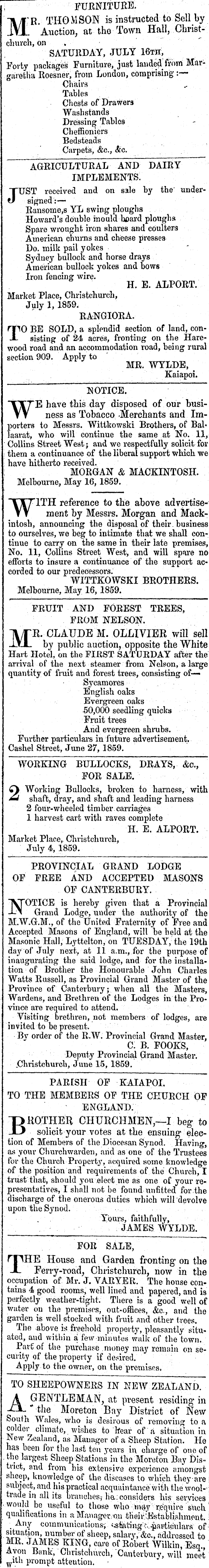 i FURNITURE^ MR. THOMSON is instructed to Sell by Auction, at tho Town Ha 11,,. Christ-: ' church, on SATURDAY, JULY 16tH, Forty packages Furniture, just landed from Margaretlia Roesner, from London, comprising :— Chairs Tables Chests of Drawers Washstands Dressing Tables Cheffioniers Bedsteads , Carpets, &c, &c. AGRICULTURAL AND DAIRY implements; . j TUST received and on sale by the' under- j O signed ■':-— Ransome,s YL swing ploughs Howard's double mould hoard ploughs Spare wrought iron shares and coulters American chums and cheese presses Do. milk pail yokes Sydney bullock and horse drays American bullock yokes and bows Iron fencing wire. H. E. ALPORT. Market Place, Christchurch, July 1,1859, RANGIORA. TO BE SOLD, a splendid section of land, consisting of 24 acres, fronting on the Harewood road and an accommodation road, being rural section 909. Apply to MR. WYLDE, Kaiapoi. — NOTICE. ~~ WE have this day disposed of our business as Tobacco Merchants and Importers to Messrs. Wittkowski Brothers, of Ballaarat, who will continue the same at No. 11,: Collins Street West; and we respectfully solicit for them a continuance of the liberal support which we ■ have hitherto received. ; MORGAN & MACKINTOSH. Melbourne, May 16,1859. WITH reference to the above advertisement by Messrs. Morgan and Mackintosh, announcing the disposal of their, business to ourselves, we beg to intimate that we shall continue to carry on the same in their late premises, No. 11, Collins Street West, and will spare no efforts to insure a continuance of the support accorded to our predecessors. WITTKOWSKI BROTHERS. Melbourne, May 16,1859. FRUIT AND FOREST TREES, FROM NELSON. MR. CLAUDE M. OLLIVIER will sell by public auction, opposite the White Hart Hotel, on the FIRST SATUEDAY after the arrival of the next steamer from Nelson, a large 1 quantity of fruit and forest trees, consisting of— Sycamores English oaks Evergreen oaks 50,000 seedling quicks Fruit trees And evergreen shrubs. Further particulars in future advertisement. Cashel Street, June 27, 1859. WORKING BULLOCKS, DRAYS, &c, FOR SALE. 2 Working Bullocks, broken to harness, with shaft, dray, and shaft and leading harness 2 four-wheeled timber.carriages 1 harvest cart with raves complete H. E. ALPORT. Market Place,. Christchurch, July 4, 1859. PROVINCIAL GRAND LODGE OF FREE AND ACCEPTED MASONS OF CANTERBURY. "VTOTICE is hereby given that a Provincial J-^l Grand Lodge, under the authority of the M.W.G.M., of the United Fraternity of Free and Accepted Masons of England, will he held at the Masonic Hall, Lyttelton, on TUESDAY/ the 19th day of July next, at 11 a.m., for the purpose of inaugurating the said lodge, and for the installation of Brother the Honourable John Charles Watts Russell, as Provincial Grand Master of the Province of Canterbury; when all the Masters, Wardens, and Brethren of the Lodges in the Province are required to attend. Visiting brethren, not members of lodges, are invited to be present. By order of the R.W. Provincial Grand Master, C. B. FOOKS, Deputy Provincial Grand Master. .Christchurch, June 15, 1859. PARISH OF KAIAPOI. TO THE MEMBERS OF THE CHURCH OF ENGLAND. BROTHER CHURCHMEN,—! beg to solicit your votes at the ensuing election of Members of the Diocesan Synod. Having, as your Churchwarden, and as one of the Trustees for the Church Property, acquired some knowledge of the position and requirements of the Church, I trust that, should you elect me as one of your representatives, I shall not be found unfitted for;the discharge of the onerous duties which will devolve upon the Synod. •.-.,-■ . . Yours, faithfully, JAMES WYLDE. FOR SALE, ; rpHE House and Garden fronting on the X Ferry-road, Christchurch, now in the occupation of Mr. J. VARYER. The house contains 4 good rooms, welllined and papered, and is perfectly weather-tight. There is a good well of water on the premises, out-offices, &c, and the garden is well stocked with fruit and other trees. Tho above is freehold property, pleasantly situated, and within a few minutes walk of the town. Part of the purchase money may remain on security of the property if desired. / Apply to the owner, on the premisps. TO SHEEPOWNERS IN NEW ZEALAND. A GENTLEMAN, at present residing in -£*_ * the More ton Bay District of New South Wales, who is desirous of removing to a colder climate, wishes to Ifear of si situation in New Zealand, as Manager of a Sheep Station. He has been for the last ten years in charge of one of the largest Sheep Stations in the Morelon Bay Dis» ; tnet, and from his extensive experience amongst ; sheep, knowledge, of the diseases to which they are \ subject, and his practical acquaintance with the wool--; trade in all its branehesj ha:considers his services ' -would be useful to those who mtty require such ■ qualifications in a Managec-on ■their.'.Establishm.ent. • Any communications', of M«atT o An;T^t eT^ slieeP' salai T. &C addressed to MR. JAMES KING, care of Robert Wilkin, Esq. Avon Bank"/Christchuvch, Canterbury, will meet w xth prompt attention. •