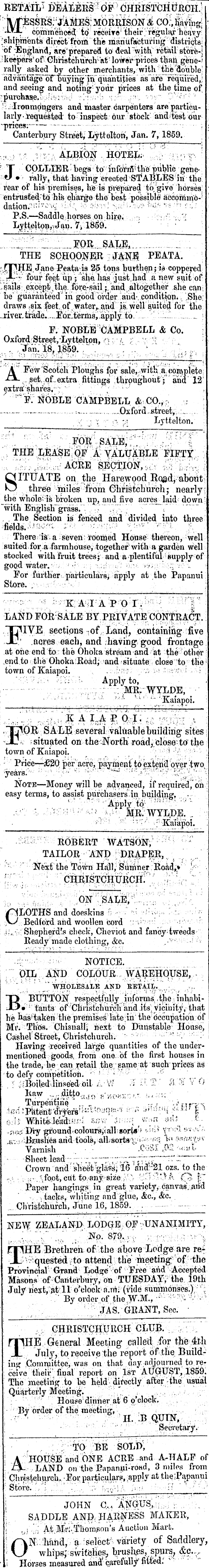 I RETAIL' DEALERS 'OP OHRISTCHtfROII.' '( JV/TESSRS. JAMES' MORRISON & CO., Having, -L?_L commenced* to receive their regulajr heavy 'shipments direct from the manufacturing districts, of England, are'prepared to deal with retail store-' keepers'of Christchurch at lower prices than gene-'1 rally asked by other merchants, with the double advantage of "buying in quantities as are required, and seeing and noting your prices at the time of purchase. Ironmongers and master carpenters ar« particu-larly-requested to inspect our stock and test our — - Canterbury Street, Lyttelton, Jan. 7,1859. - ' ALBION HOTEL. J COLLIER begs to inform" the public gene- • rally, that having erected STABLES in the rear of his premises, he is prepared to give horses entrusted to his charge the best possible accommodation. > ••- - ■ ' P.S.—Saddle horses on hire. Lyttelton,, Jan- 7* 18E>9. FOR SALE, THE SCHOONER JANE. PEATA. HPHE Jane Peata is 25 tons burthen; is coppered -L • four feet up ; sha has just had a new suit of sails except s the fore-sail; and altogether she can be guaranteed in good order and- condition. She draws six feet of water,, and ,is well suited for the river, trade- . Dor.terras, apply to F. NOBLE CAMPBELL & Co. Oxford Street,'Lyttelion,'> < . Jan. 18,1859. A Few Scotch Ploughs for sale, with a complete set of extra fittings throughout;' and 12 extra shares. "F. NOBLE CAMPBELL & CO., - .Oxford street, • -• Lytrelton. FOR SALE, THE LEASE OP A VALUABLE FIFTY ACRE SECTION, SITUATE on the Harewood Road, about three miles from Christchurch; nearly the whole is broken up, and five acres laid down with English" grass. The Section is fenced and divided into three fields. ' i There is a seven roomed House thereon, well suited for a farmhouse, together with a garden well stocked with fruit trees; and a plentiful supply of good water. i For further particulars, apply at the Papanui , Store. X A I A P 0 I. LAND FOR SALE BY PRIVATE CONTRACT. EIVE sections of Land, containing five acres each, and having good frontage at one end to the Ohoka stream and at the other end to the Ohoka Road, and situate close to the town of Kaiapoi. Apply to, MR. WYLDE, Kaiapoi. . KAIiPOL. EOR SALE several valuable building sites situated on the North road, close to the town of Kaiapoi. ' Price—£2o "per acre, payment to extend over two, years. " .*>--.<, Note—Money will be advanced, if required, on easy terms, to assist purchasers in building, • Apply to MR.WYL.DE. . Kaiapoi. ROBERT WATSON, TAILOR AND DRAPER, Next the Town Hall, Sumner Road,* ' christchurch/ ON SALE, /CLOTHS and dopskins V/ Bedford and woollen cord Shepherd's check, Cheviot and fancy tweeds Ready made clothing, &c. NOTICE. OIL AND COLOUR WAREHOUSE, * WHOLESALE AND UETAIL. B BUTTON respectfully informs the inhabi- • tants of Christchurch and its vicinity, that he has taken the premises late in the occupation of Mr. Ttios. Chisnall, next to Dunstable House, Cashel Street, Christchurch. Having received large quantities of the undermentioned goods from one of the first houses in the trade, he can retail the same at such prices as to defy competition. , Boiled linseed oil . • . I'• ■f> Itaw . ditto , lo j. /(l , , - , . Turpentine ... /,,,- iV dryers'-""- '' ";'' ' >v " '* l fc ■ '■, WhiteJettd:- -..„>. ,f - •" -' \ '' ..r Dry groundcolours^all sorts'- • '\' "' '• - .tr. Brushes arid tools, allrsorts i, , • ,i'l '"•*/"' Varnish f- '-' £ - -'l Sheet lead .„ ; — /\;.T",7 -"" Crown and sheet glass, 16 nnd'-21 ozs. to the foot, cut to any size '*'■ i"? r" Paper hangings in great variety, canvas, and tacks, whiting and glue, &c, &c. Christchurch, June 16, 1859. - NEW ZEALAND LODGE OF UNANIMITY, ' No. 879. THE Brethren of the above Lodge are re- • quested to attend the' meeting of the Provincial Grand Lodge' of Free and Accepted Masons" of Canterbury, on TUESDAY, the 19th July next, at 11 o'clock a.m. (vide summonses.) By order of the W.M., - JAS. GRANT, Spc. CHRISTCHURCH CLUB. THE General Meeting called for the 4th July, to receive the report of the Building Committee, was on that aay adjourned to receive their final report on Ist AUGUST, 1859. The meeting to be held directly after the usual Quarterly Meeting. House dinner at 6 o'clock. By order of the meeting, * 11. .B QUIN, Secretary. TO BE SOLD, A HOUSE and ONE ACRE and A-HALF of LAND on the Papanui-rohd, 3 niilos from Chwstchurch. For particulars, apply at the Papanui Store. . JOHN C, ANGUS, SADDLE AND HARNESS MAKER, At Mr. Thomson's Auction Mart. ON hand, a select variety of Saddlery, whips; switches, brushes, spurs, &c. r Horses measured and' carefully' fitted: '