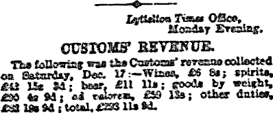 Tout OBee, Monday Bvataff. CUSTOMS’ REVENUE. -w-» *Aiiiwtaf sraa 'the Carton* rowano collected tm aateudiy. Doe, 17:—Wires, £6 8s ; spirit*. Ml IkU: beer, £ll Us; food* by »ci*ht, £3O to Mi l U «S »; olh* dntlw, £ttUsMttOtal*£793UsSd.