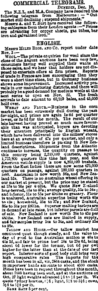 COMMERCIAL TELEGRAMS. Dome*. Deo. I®. The HAL and HJL Company have roo*i7»dtho fetua Jwbounss i*“ CNtfc ■asasssKssa^ja{MMbkaia tram tbek todoa agsatsnso» m ednadßg for copper sharia. gas tabes, bar im aad galvsiisod iron. ENGLISH. Kenrt&njts Bias. *s® Co. report ante date Bo*. 3t Wool.—The private enquiries for weed etaoa the <Se«e<*£tlae Aeinasl aasfcocs have beer very Caw, Sum haring well supplied their 'wants at those orita. and are hear that holdara ere not die. p<mdto<BUartairoeo» at firm departs «saoma«li* than they wme a short time rise*, but in Oemo* tasiMM ms* tepraffleaHOit* Iccwawd tdijity pw* nils in dj'QY ay will protMOdy beagoeddemand foe rnediaa wool* at the Mod seme to open ea Bo*. 22. The fresh arrivals to drill amount to G3.SSS bales, and 45,000 hell over. Wheat a»» Fw>r*.-B=»lne» la tho own market haa been extremely doll daring the past fortnight, and erioea are again I*M per quarter Uwcr.orSsCdfor the month. The molt of oar jg&g SmTtert bjt l v|sg able than «u anticipated, buyera are devoting their ctauos principally to English wheat*, which hare bees delivered into the miliere* store* here at an average of 47* per quarter, awl only a limited bsrincM therefore U parting ta New Zealand deaeriythma. Hhlpacste from the Atlantic esattsa* to inewine, the quantity on pteiato to thia eoantry bssny qa&rtaw, against 1.725.8® qaitrura this Ume last year, and the Ammcxs variate supply la now 4,20i»/.CO bnrtcl*. Prom (he But In dies there are now acme 473.0® quartets on ptsaage, agaiaat Iffl.WD quartern in lag®. Australian Is now worth Mb and Kew Zesr land 51a There is no Auslrtlka wheat offering to oar market at present, but the price may be stated at £7* to 58* per We quote Hew Z .-aland loac-temod, s 5« to 57* j avertm quality, 53* to 54»| and Uterior. Sit to S3* per Ma ex granary. Flour It unaltered. Australian superfine being worth 40* t© «&>; houKchrid, SSs to 37f i KOl Hew Zealand, Ms to Sis per SUX-ia. Ea;«mor malticg barleys are In demand at brie rates, but inferior parsels arc dull of sale. New Zealand 1* now worth 56s to 45i per 4401 U. h'«w Zeeland oats are limited la supply, aad falramplm bring Sa# toSts.aM ordinary sis to Ms. Taixow asp Hites.—Oor tallow market toe oonuetted quiet though steady, and the value today oi r'-od to fine Auriraiun msttoo ts *o* to 41* S 6, and fair to prime boef 38s to 35s (M, being shout <4 lower foe the former, but 4J par ewt higher for the latter than at the date of our last tt-port. Interior ears* ol good body euli brteg very high eompsrriite rates The imports for the mealh has bees in all, nz, £4Gi carts, and the stock in importers' hinds to »J»at 4500 casks. Hines have boss ta request throughout this month, about JOUti haring beeu mi 4, a»d at the auoUose on UcC 27 light weights adraaoed id to id per lb. We quote liydacy heavies, ( [i; Ught, lid to lid s cows, V,l it tfd per lb. Hi SB Hit* 5 per cent.
