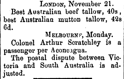 London, November 21. Best Australian beef tallow, 40s , best Australian mutton tallow, 42s 6d. Melbourne, Monday. Colonel Arthur Scratchley is a passenger per Aconcagua. The postal dispute between Victoria and South Australia is adjusted.