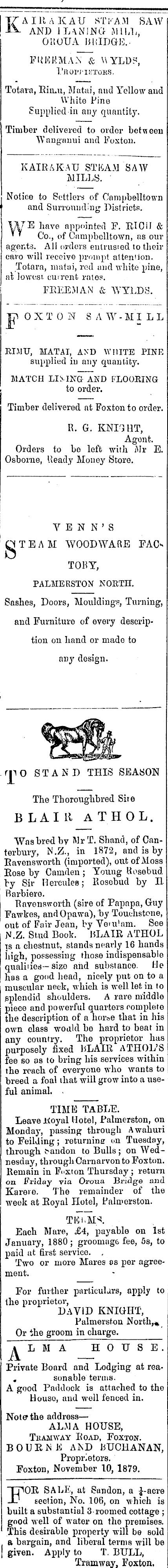 7 KA IRA KA U ST !• A M S A W AND 1 LAN ING MILL, OROUA BiiIDGE.. FU IO MM AN & WYLD?, I'nOIM'IiiTOKS. Totara, Bin»u, Matai, and Yellow and White Fine Supplied in any quantity. Timber delivered to order between Wangumii and Foxton. KAIRAKAU STICAM SAW MILLS. Notice to Settlers of Campbelltown and Surrounding Districts. W" E have appointed F. ElCil & ' ' Co., of Campbelltown, as our agents. All orders entrusted to their earo will receive prompt attention. Totara, matai, rod and white pine, at lowest, current rates. FREEMAN & WYLDS. JP OXT 0 N SAW- MI L L RLUU, MATAI, AND WHITE PINE supplied in any quantitj'. MATCH LIMNQ AND FLOORING to order. Timber delivered at Foxton to order. R. G. KNIQHT, Agent. Orders to be left with Mr E. Osborne, Heady Money Store. VENN'S n TEA IE WOOD WARE FAC* TOBY, PALMERSTON NORTH. Sashes, Doors, Mouldings, Turning, and Furniture of every description on hand or made to any design. rp O STAND THIS SEASON The Thoroughbred Sire B LAI H ATHOL. Was bred by Mr T. Shand, of Canterbury, N.Z., in 1872, and is by Eavensworth (imported), out of Moss Eose by Camden ; Young Rosebud \y Sir Hercules; Rosebud by II Barbiere. Ravensworth (sire of Papapa, Guy Fawkes, andOpawa), by Touchstone, out of Fair Jean, by Yemlam. See I N.Z. Stud Book. HLAIE ATHOL is a chestnut, stands nearly 16 hands high, possessing those indispensable qualified— size and substance. He has a good head, nicely put on to a muscular neck, which is well let in to splendid shoulders. A rare middle piece and powerful quarters complete the description of a hor»e that in his own class would be hard to beat in any country. The proprietor has purposely fixed bLAIE ATHOL'S fee so os to bring his services within the reach of everyone who wants to breed a foal that will grow into a useful animal. - TIME TABLE. Leave Koyal Hotel, Palmerston, on Monday, passing through Awahuri to Feilding ; returning on Tuesday, through v v <andon to Bulls ; on Wednesday, through Carnarvon to Foxton. Remain in Fuxton Thursday ; return on Friday via Oroua Bridge and Karere. The remainder of the week at Eoyal Hotel, Palii>erston. TKi.MA Each Mare, £4, payable on Ist January, 1880 ; groomage fee, ss, to paid at first service. , Two or more Mares os per agreement. For further particulars, apply to the proprietor, DAVID KNIGHT, Palmerston North,* Or the groom in charge. a L M A HOUSE. Private Board and Lodging at rea- « sonable terms. A good Paddock is attached to the Houso, and well fenced in. Noterthe address — ALMA HOUSE, TItAAIWAY EOAD, FOXTON. BOUENIi AND BUCHANAN, Proprietors. Foxton, November 10, 1879. FOE SALE, at Sandon, a J-acre section, No. 106, on which is built a substantial 3- roomed cottage ; good well of water on the premises. This desirable property will be sold a bargain, and liberal terms will be j given. Apply to T. BULL, Tramway, Foxton.