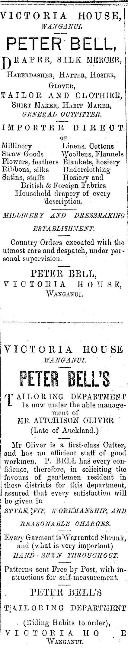 VIOTOKIA HOUSE, WANGANUI. ] PETER BELL, V\ RAP ER, S I L K MEKCEB, Haberdasher, Hatter, Hosieh, Gloveh, TAILOR AND CLOTfllEft, Shirt Maker, Habit Maker, GENERAL OUTFITTER. IM PORTE E DIE E0 T OF Millinery Linens. Cottons Straw Goods "\yoollens, Flannels Elowers, feathers Blankets, hosiery Ribbons, silks Underclothing ' Satins, stuffs Hosiery and j British & Foreign Fabrics Household drapery .of every ; 'description. MILLINERY AND DRESSMAKING ESTABLISHMENT. Country Orders executed with the utmost care and despatch, under per* sonal supervision. PETER~BELL, VICTORIA HOUSE, Wanganui. VICTORIA HOUSE WANGANUI. PETEBIELL'S (V AI L 0 11 ING DEPARTMENT *- Ts now under the able management of MR AITUHISON OLIVER " (Late of Auckland.) i Afr Oliver is a first- class Cutter, 1 and has an efficient staff of good workmen. P. BELL has every' coufidenpe, therefore, in soliciting the favours of gentlemen resident in these districts for this department, assured that every satisfaction will I be given in STYLE, ]FIT, WORKMANSHIP, AND REASONABLE CHARGES. Every Garment isWta'ranted Shrunk, and (what is very important) HAND - SRTiJST THROUGHOUT. Patterns sent Free by Post, with instructions for self-measurement. peteiTbell's ■T«4.IL 0R I N G DK PARTMENT (Riding Habits to order), VICTORIA II 0 E "WaxgAXUT; I