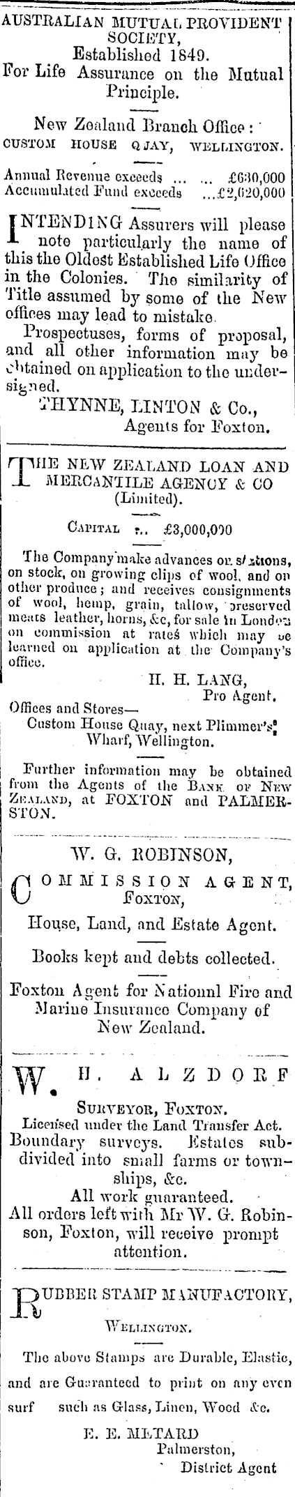 AUSTRALIAN MUTUAL PROVIDENT SOCIETY, Established 1849. For Life Assurance on the Mutual Principle. New Zealand Branch Office : ' CUSTOM HOUSE QJAY, WELLINGTON. Annual Revenue exceeds £080,000 Accumulated Fund exceeds ...£2,020,000 INTENDING Assurers will please ■*• note particularly the name of this the Oldest Established Life Ofßce in the Colonies. The similarity of Title assumed by some of the New offioes may lead to mistake. Prospectuses, forms of proposal, and all other information nuay be obtained on application to the undersigned. THYNNE, LINTON & Co., Agents for Foxton. THE NEW ZEALAND LOAN AND 1 MERCANTILE AGENCY & CO (Limited). Capital r.. £3,000,000 The Company "make advances or. s/jsttons, on stock, on growing clips of wool, and on other produce ; and receives consignments of wool, hemp, grain, tallow, preserved meats leather, horns, &c, for sale in Londra on commission at rates which may oe learned on application at the Company's office. 11. H. LANG, j . Pro Agent. I Offices and Stores — Custom House Quay, next Plimraer's! Wharf, Wellington. Further information may be obtained j from the Agents of the Bask ov Nicw Zka.lakd, at FOXTON and PALMEKSTON. W. G. BOBJNSON, COMMISSION AGENT, Foxton, :; House, Land, and Estate Agent. Books kept and debts collected. Foxton Agent for Nationnl Fire and Marine Insuvanco Company of New Zealand. W- II . A L ZBQ E F • Sukybyor, Foxton. Licensed under the Land Transfer Act. Boundary surveys. Estates subdivided into small farms or townships, &c. All work guaranteed. All orders left with Mr W. G. Robinson, Foxton, will receive prompt attention. ■pUDBEB STAMP MANUFACTORY, Jl\) Wellington. The above Stamps are Durable, Elastic, and are Guaranteed to print on any even surf such as Glass, Linen, Wood &c. E. E. METARD Palmerston, District Agent