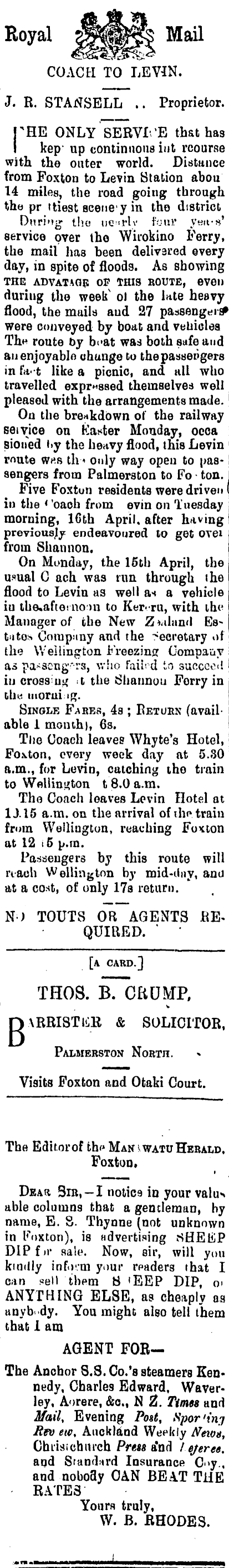 Royal jgSJs Mail COACH TO LEVJN. J. R. STANSELL .. Proprietor. THE ONLY SERVICE that has I kep" up continuous iut rcourse with the outer world. Distance from Foxton to Levin Station abou 14 miles, the road going through the pr ttiest seene 1 y in tho district • During the iie-<rlv four yeu-s' service over tho Wirokino Ferry, the mail has been delivered every day, in spite of floods. As showing THE ADVATAGE OP THIS ROUTE, 6V6U duriug the week" ol the late heavy ' flood, the mails aud 27 passengers* were conveyed by boat and vehicles The route by beat was both safe and an enjoyable change to the passengers | in fa-t like a picnic, and all who travelled exposed themselves well pleased with the arrangements made. On the breakdown of the railway seivice on Kaster Monday, occa l sioued t.y the heavy flood, this Levin mute Wf.s th-« only way open to passengers from Palmerston to Fo - ton. Five Foxtun residents were driven i in the < 'oach from evin on Tuesday morning, 16th April, after having previously endeavoured to get ovei from Shannon. On Monday, the 16th April, the usual C ach was run through the flood to Levin as well an a vehicle iv the.afiet no m to Ker-ru, with the Manager of the New Zealand Estutos Corapsiny and the Secretary of the Wellington Freezing Company I as pa*aeng"-rs, who Fail' d to succco<l iv cross: ug .t the iShannou Forry in I tlie moruiig. Single Fares, 4s ; Return (availi able 1 month), 6s. Tiie Coach leaves Whyte's Hotel, Foxton, every week day at 5.30 a.m., for Levin, catching the train to Wellington 1 8.0 a.m. The Coach loaves Levin Hotel at 1J.15 a.m. on the arrival of the train from Wellington, reaching Foxton at 12 t5 p.m. Passengers by this route will ri-ach Wellington by mid-dny, and at a cost, of only 17a return. N) TOUTS OR AGENTS RE. QUIRED. ' ' [a card.] THOS. B. CRUMP, BARRISTtiK & SOLICITOR, Palmerston North. Visits Foxton and Otaki Court. The Editor of thf Man kWATU Herald, Foxton, Dear Sib, -I notic 9in your valus able columns that a gentleman, by name, E. 8. Thynne (not unknown in Foxton), is Hdvertising SHEIiP DlPf)i* sale. Now, sir, will you kindly inform your readers that I can sell them S 'EEP DIP, o> ANYTHING ELSE, as cheaply as anybody. You might also tell them that 1 am AGENT FORThe Anchor S.S. Co.'s steamers Ken* nedy, Charles Edward, Waverley, Aorere, &0., N Z. Times and Mail, Evening Post, Spor'inj Rvo etc, Auckland Weekly ffleios, Chiisichurch Press and lejeree. aqd Standard Insurance C<>y., and noboay CAN BEAT THE RATES' Yours truly, W. B. RHODES.