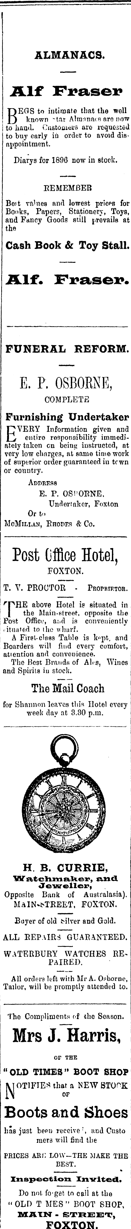 ALMANACS. ILlf Fraser BEGS to intimate that the well known "tat AlmnnacH are now to liaud. Customers are requested to buy early in order to avoid disappointment. Diarys for 1896 now in stock. EE MEMBER Best values and lowest pricPß for Bonks, Papers, Stationery, Toys, and Fancy Goods still prevails at the Cash Book & Toy Stall. ILlf. Fraser. FUNERAL REFORM. E. P. OSBOKNE, COMPLETE Furnishing Undertaker F7VEEY Information given and _T_r entire responsibility immediately taken on being instructed, at very low charges, at same time work of superior order guaranteed in town or country. Address E. P. OSPOENE. Undertaker, Foxton Or to MoMiLtAN, Ehodes & Co. Post Office Hotel, FOXTON. T. V. PROUTOR - Proprietor. r PHE above Hotel is situated in I the Main-street, opposite the Post Office, a:id is conveniently i-itnated to the wharf. A First- class Table is k p pt, and Boarders will find every comfort, attention and convenience. The Best Brands of Alks, Wines and Spirits iv stock. The Mail Coach for Shannon leaves this Hotel every week day at 3.30 p.m. H. B. CURRIE, i Watchmaker, and ' OTewellex*) Opposite Bank of Australasia). MAIN^TEEET, FOXTON. Buyer of old bilver and Gold. ALL REPAIRS GUARANTEED. WATERBURY WATCHES REPAIRED. All orders left with Mr A. Osborne, Tailor, will be promptly attended to. The Compliments of the Season. Mrs J. Harris, OF THE "OLD TIMES" BOOT SHOP NOTIFIES that a NEW BTO^K OP Boots and Shoes has just been receive', and Custo mers will find the PEICES ARr: LOW-THE MAKE THE BEST. _________ » Inspection Invited. Do not fo-get to call at the "OLD T MES " BOOT SHOP, MAIN - STREET, t FOXTON. i