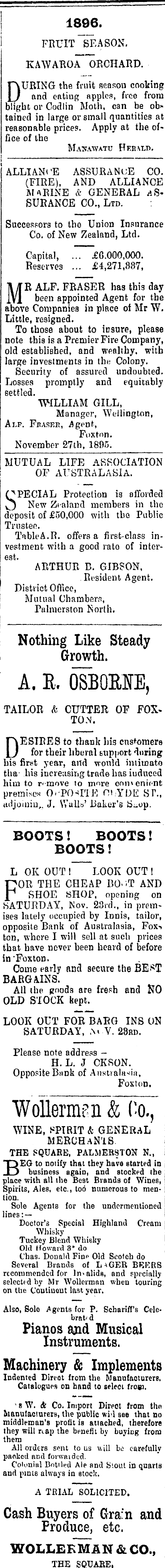 1806. I i FRUIT SEASON. KAWAROA ORCHARD. DURING the fruit seasou cooking and eating apples, free from blight or Codlin Moth, can be obtained in large or small quantities at reasonable prices. Apply at the office of the Maxvwatu Hebaltj. | ALLIANCE ASSURANuE CO. (FIRE), AND ALLIANCE MARINE & GENERAL ASSURANCE CO., Ltd. : Successors to the Union Insurance Co. of New Zealand, Ltd. Capital, ... £6.000,000. Reserves ... £4,271,887, MR ALF. FRASER has this day been appointed Agent for the above Companies in place of Mr W. Little, resigned. To those about to insure, please note this is a Premier Fire Company, old established, and wealthy, with large investments in the Colony. Security of assured undoubted. Losses promptly and equitably settled. WILLIAM GILL, Manager, Wellington, Alp. Fbaskb, Agent, Fox ton. November 27th, 1895. MUTUAL LIFE ASSOCIATION OF AUSTRALASIA. QPECIAL Protection is afforded New Zealand members in the deposit of £50,000 with the Public Trustee. TnbleA.R. offers a first-class investment with a good rato of interest. ARTHUR B. GIBSON, Resident Agent. District Office, Mutual Chambers, i Palmerston North. Nothing Like Steady Growth. A. B. 08B0EBE, TAILOR & CUTTER OF FOXTON. T^ESIRES to thank his ens'omere \J for their liberal support during his first year, and wonld imiumto tha' his increasing trade has iudnced him to r'-move to more cnmenir j nt premises OPPOSITE ru.-YDE ST., rtdjoiniu,. J. Walls' Baker's S^op. I BOOTS! BOOTS! BOOTS ! L OK OUT ! LOOK OUT ! COR THE CHEAP 80-T AND P SHOE BHOP. opening on SATURDAY, Nov. 23rd., in premises lately occupied by Innis, tailor, opposite Bank of Australasia, Fox> ton, where I will sell at such prices that have never been heard of before in "Fox ton. Come early and secure the BEST BARGAINS. All the goods are fresh and NO OLD STOCK kept. LOOK OUT FOR BARG INS ON SATURDAY, .\» V. 28rd. Please note address - H. L. J CKSON. Opposite Bunk of Australasia, Foxton. Wollermsn & Co., WINE, SPIRIT & GENERAL MERCHaN'IB. THE SQUARE, PALMERSTON N., BEG to notify that they have started in business again, and stocked the place with all the Best Brands of Wines, Spirits, Ales, etc. , too numerous to mention. Sole Agents for the undermentioned lines: — Doctor's Special Highland Cream Whisky Tuckey Blend Whisky Old Howard 3* do Chas. Donald Finp Old Scotch do Several Brands of LaGER BEERS recommended for Invalids, and specially selected by Mr Wollerman when touring on the Continent last year. Also, Sole Agents for P. Schariffs Celebrated Pianos ajid Musical Instruments. Machinery & Implements Indented Direot from the Manufacturers. Catalogues on hand to select frog], 1b W. & Co. Import Direot from thn Manufacturers, the public wi>l see that no middleman's profit is attached, therefore they will nap the benefit by buying from them All orders sent to us will bo carefully packed and forwarded. Colonial Bottled Ale and Stout in quarts and pin 16 always in stock. A TEIAL SOLICITED. Cash Buyers of Grain and j Produce, etc. j WOLLEKMAN & CO., I THE SQUARE,
