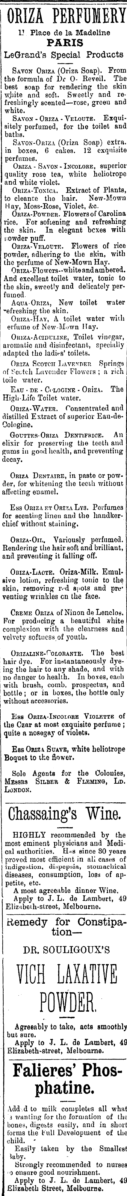 ORIZA PERFUMERY 1? Place de la Madeline PARIS LeGrand'a Special Products Savon Oriza (Oriza Soap). From the formula of Di* O- Reveil. The best soap for rendering the 6kin wjjite and soft. Sweetly and refreshingly scented — rose, green and white. Savon - Oriza - Veloute. Exquisitely perfumed, for the toilet and baths. Savon-Oriza (Oriza Soap) extra. in boxes, 6 cakes. 12 exquisite perfumes. Oriza - Savon - Incolore, superior quality rose tea, white heliotrope and white violet. Oriza-Tonica. Extract of Plants, to cleanee the hair. New-Mown Hay, Moss-Rose, Violet, &c. Oriza-Powder. Flowers of Carolina rice. For softening and refreshing the skin. In elegant bcxes with nowder puff. Oriza- Veloxjte. Flowers of rice powder, adhering to the skin, with the perfume of New-Mown Hay. ORiZA-Flowers-white and ambered. And excellent toilet water, tonic to the skin, sweetly and delicately perfumod. Aqua- Oriza, New toilet water refreshing the skin. Oriza-Hay, A toilet water with erfuuie of New-Mown May. Omza-Aciduline, Toilet vinegar, aromatic and disinfectant, specially adapted tho ladies' toilets. Oriza Scotch Lavender Springs of Scctch Lavender Flowers ; a rich toile water. Eau •de - Ci'LOGine - OnizA. The High -Life Toilet water. Oriza-Water. Consentrated and distilled Extract of superior Eau-de-Oologine. Gouttes- Oriza Dentifrice. An elixir for preserving the teeth and gums ia good health, and preventing decay. Oriza Dentaire, in paste or powder, for whitening the teeth without affecting enamel. Ess Oriza et Oriza Lys. Perfumes for scenting linen and the handkerchief without staining. Oriza-Oil. Variously perfumed. Rendering the hair soft and brilliant, and preventing it falling off. Oriza-Laote. Oriza-Milk. Emulsive lotion, refreshing tonic to the skin, removing ivd spots and pre' venting wrinkles en the face. Creme Oriza of Ninon deLencloe. For producing a beautiful white complexion with the clearness and velvety softness. of youth. Orizaline-Polorante. The best hair dye. For instantaneously dyeing the hair to any shade, and with Ino danger to health. In boxes, each | with brush, comb, prospectus, and 1 bottle ; or in boxes, the bottle only without accesaories. Ess Oriza- Incolore Violette of the Czar at most exquisite perfume ; quite a nosegay of violets. Ess Oriza Suave, whito heliotrope Boquet to the flower. Sole Agents for the Colonies, Messrs Silber & Fleming, Ld. London. Chassaing's Wine. HIGHLY recommended by the most eminent physicians and Medical authorities. H-is since 80 years proved most efficient in all cases of indigestion, di.spepsia, stoiuachical diseases, consumption, loss of appetite, etc. A most agreeable dinner Wine. Apply to J. L. de Lambert, 49 Elizab6ih-street, Melbourne. Remedy for Constipation— DR. SOULIGOUX'S vich laxative ;.■ powder. Agreeably to take, acts smoothly but sure. Apply to J. L. de Lambert, 49 r Elizabeth-street, Melbourne. Falieres' Phosphatine. Add d to milk completes all what 3 wanting for the formation of the , bones, digests easily, and in short forms the bull Development of the child. - Easily taken by the Smallest r iaby. Strongly recommended to nurses - o ensure good nourishment. Apply to J. L. de Lambert, 49 Elizabeth Street, Melbourne.