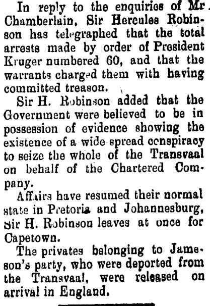In reply to the enquiries of We 4 Chamberlain, Sir Hercules Robinson has telegraphed that the total arrests made by order of President Kruger numbered 60, and that the warrants charged them with having committed treason. v SirH. Robinson added that the Government were believed to be in | possession of evidence showing the existence of a wide spread ocnspiraoy ! to seize the whole of the Transvaal on behalf of the Chartered Company. Affiira have resumed their normal state in Pretoria and Johannesburg, bir H. Robinson leave 3at once for Capetown. The privates belonging to Jameson's party , who were deported from the Transvaal, were released on arrival in England.