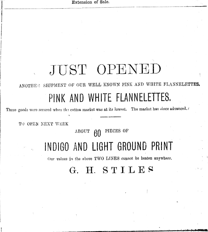 Extension of Sale. . JUST OPENED ANOTHER SHIPMENT OF OUB WELL KNOWN PINK AND WHITE FLANNELETTES. PINK AND WHITE FLANNELETTES. These goods were secured when the cotton market was at its lowest. The market has since advanced./ TO OPEN NEXT WEEK ABOUT DA PIECES OF INDIGO AND LIGHT GROUND PRINT Our values in the above TWO LINES cannot be beaten anywhere, G. H. STILES
