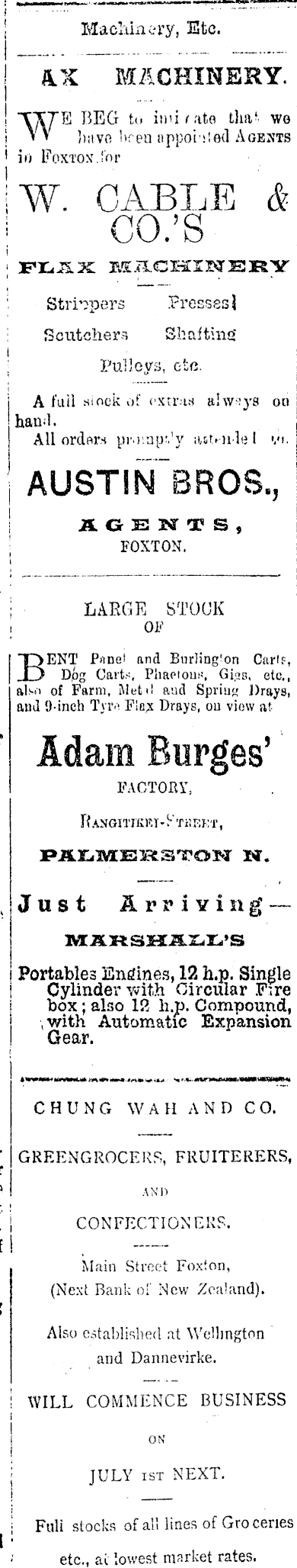 Machinery, Etc. AX MACHINERY. WE BEG to imitate that wo j have been nppoi Rod Agents , 1 io Foxton. for iW. CABLE '& \ CO.’S ; WT4ILX. mJtLCKfIIffERY I Strippers Presses 1 Scutchers Shafting i j ; Pulleys, etc. j j t I A fail siock of extras always on I hand. All orders pr.nnpCy asMile 1 vt. AUSTINBROS., | AGENTS, ; FOXTON. LARGE STOCK OF BENT Pnnd and Burlington Curlf, D(l)g Carts, Phaetons, Gigs, etc,, also of Farm, Met 1 1 and Spring Drays, and 0-inch Tyr-i Flax Drays, on view at Adam Burges’ FACTORY, RANGITmKT-STKKET, PALMERSTON If. Just Arriving j Portables Engines, 12 h.p. Single j Cylinder with Circular .Fire box; also 12 h.p. Compound, ,with Automatic Expansion Gear. CHUNG WAH AND CO. i GREENGROCERS, FRUITERERS, I i AND i . j j CONFECTIONERS. j j Main Street Foxton, (Next Bank of New Zealand). Also established at Wellington and Dannevirke. I WILL COMMENCE BUSINESS ON JULY ist NEXT. Full slocks of all lines of Groceries etc., at lowest market rates.