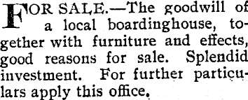 OR SAIrE. —The goodwill of a local boardinghouse, together with furniture and effects, good reasons for sale. Splendid investment. For further particulars apply this office,