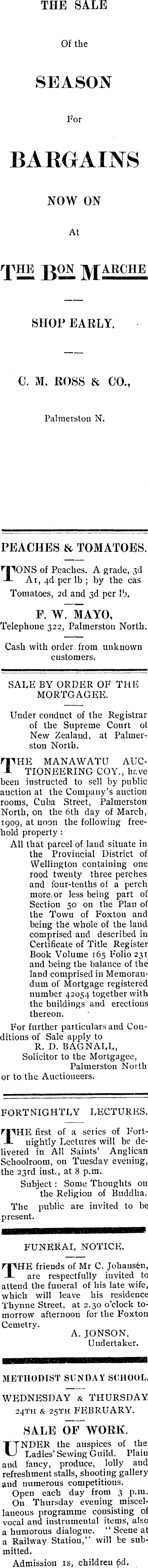 THE SALE Of the SEASON For BARGAINS NOW ON At T— Marche SHOP EARLY. C. M. ROSS & CO., Palmerston N. PEACHES & TOMATOES. r JIONS of Peaches. A grade, 3d -A At, 4d per lb ; by the cas Tomatoes, 2d and 3d per lb. F. W. MAYO, Telephone 322, Palmerston North. Cash with order from unknown customers. SALE BY ORDER OF THE MORTGAGEE. Under conduct of the Registrar of the Supreme Court ol New Zealand, at Palmerston North. The manawatu auctioneering COY., have been instructed to sell by public auction at the Company’s auction rooms, Cuba Street, Palmerston North, on the 6th day of March, 1909, at noon the following freehold property: All that parcel of laud situate in the Provincial District of Wellington containing one rood twenty three perches and four-tenths of a perch more, or less being part of Section 50 on the Plan of the Town of Foxtou and being the whole of the land comprised and described in Certificate of Title Register Book Volume 165 Folio 231 and being the balance of the land comprised in Memorandum of Mortgage registered number 42054 together with the buildings and erections thereon. For further particulars and Conditions of Sale apply to R. D. BAGNALL, Solicitor to the Mortgagee, Palmerston North or to the Auctioneers. FORTNIGHTLY LECTURES. TIIHE first of a series of FortA nightly Lectures will be delivered in All Saints’ Anglican Schoolroom, on Tuesday evening, the 23rd iust., at 8 p.m. Subject: Some Thoughts on the Religion of Buddha. The public are invited to be present. FUNERAL NOTICE. THE friends of Mr C. Johansen, are respectfully invited to attend the funeral of his late wife, which will leave his residence Tbynne Street, at 2.30 o’clock tomorrow afternoon for the Foxton Cemetry. A. JONSON, Undertaker. METHODIST SUNDAY SCHOOL. WEDNESDAY & THURSDAY 24TH & 25TH FEBRUARY. SALE OF WORK. UNDER the auspices of the Ladies’Sewing Guild. Plain and fancy, produce, lolly and refreshment stalls, shooting gallery and numerous competitions. Open each day from 3 p.m. On Thursday evening miscellaneous programme consisting of vocal and instrumental items, also a humorous dialogue. “ Scene at a Railway Station,” will be submitted. Admission is, children £d.