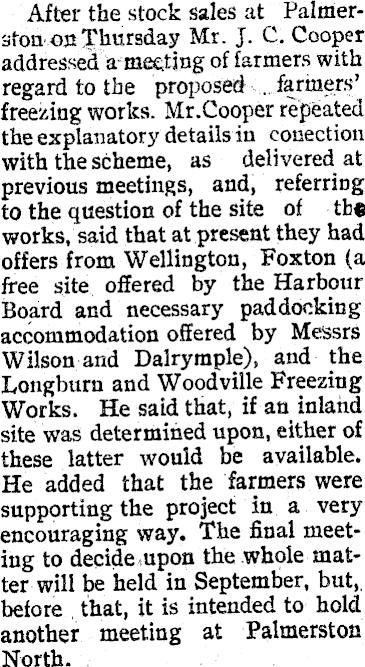 After the stock sales at Palmerstolon 'Thursday Mr - J- C. Cooper addressed a meeting of farmers with regard to the proposed farmers’ freezing works. Mr. Cooper repeated the explanatory details in conection with the scheme, as delivered at previous meetings, and, referring to the question of the site of th« works, said that at present they had offers from Wellington, Foxton (a free site offered by the Harbour Board and necessary paddocking accommodation offered by Messrs Wilson and Dalryraple), and the Longburn and Woodville Freezing Works. He said that, if an inland site was determined upon, either of these latter would be available. He added that the farmers were supporting the project in a very encouraging way. The final meeting to decide upon the whole matter will be held in September, but,, before that, it is intended to hold another meeting at Palmerston North.