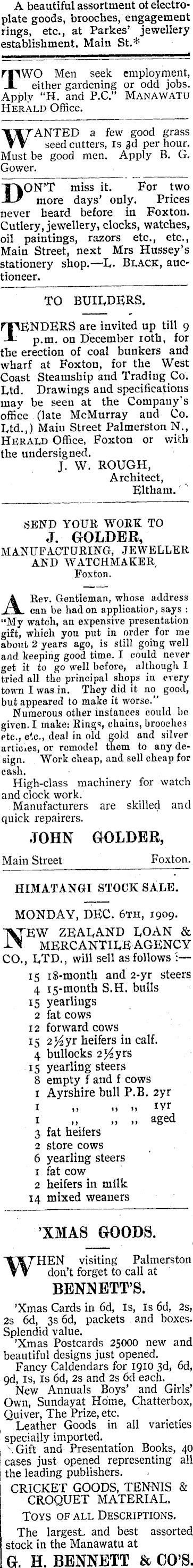 A beautiful assortment ot electroplate goods, brooches, engagement rings, etc., at Parkes’ jewellery establishment. Main St.* TWO Men seek employment, either gardening or odd jobs. Apply “H. and P.C.” MANAWATU Herald Office, TICTANTED a few good grass TV seed cutters, is gd per hour. Must be good men. Apply B. G. Gower. DON’T miss it. For two more days’ only. Prices never heard before in Foxton. Cutlery, jewellery, clocks, watches, oil paintings, razors etc., etc., Main Street, next Mrs Hussey’s stationery shop. —L. Black, auctioneer. TO BUILDERS. TENDERS are invited up till 9 p.m. on December 10th, for the erection of coal bunkers and wharf at Foxton, for the West Coast Steamship and Trading Co. Ltd. Drawings and specifications may be seen at the Company’s office (late McMurray and Co. Ltd.,) Main Street Palmerston N., Herald Office, Foxton or with the undersigned. J. W. ROUGH, Architect, Eltham.' SEND YOUR WORK TO J. GOLDER, MANUFACTURING, JEWELLER AND WATCHMAKER, Foxton. A Rev. Gentleman, whose address can be had on application, says : "My watch, an expensive presentation gift, which you put in order for me about 2 years ago, is still going well and keeping good time. I could never get it to go well before, although I tried all the principal shops in every town I was in. They did it no good, but appeared to make it worse.” Numerous other instances could be given. I make; Rings, chains, brooches etc., etc., deal in old gold and silver articles, or remodel them to any design. Work cheap, and sell cheap for cash. High-class machinery for watch and clock work. Manufacturers are skilled and quick repairers. JOHN GOLDER, Main Street Foxton. HIMATANGI STOCK SALE. MONDAY, DEC. 6th, 1909. "VTEW ZEALAND LOAN & MERCANTILE AGENCY CO., LTD., will sell as follows : 15 18-month and 2-yr steers 4 15-month S.H. bulls 15 yearlings 2 fat cows 12 forward cows 15 2 heifers in calf. 4 bullocks 15 yearling steers 8 empty f and f cows 1 Ayrshire bull P.B. 2yr i „ ivr 1 >) >) » aged 3 fat heilers 2 store cows 6 yearling steers 1 fat cow 2 heifers in milk 14 mixed weaners ’XMAS GOODS. WHEN visiting Palmerston don’t forget to call at BENNETT’S. ’Xmas Cards in fid, Is, is fid, 2s, 2s fid, 3s fid, packets and boxes. Splendid value, ’Xmas Postcards 2SOOO new and beautiful designs just opened. Fancy Caldendars for 191 b 3d, fid, 9d, is, Is fid, 2s and 2s fid each. New Annuals Boys’ and Girls’ Own, Sundayat Horae, Chatterbox, Quiver, The Prize, etc. Leather Goods in all varieties specially imported. '.Gift and Presentation Books, 40 cases just opened representing all the leading publishers. CRICKET GOODS, TENNIS & CROQUET MATERIAL. Toys of all Descriptions. The largest, and best assorted stock in the Manawatu at a H. BENNETT & CO’S.