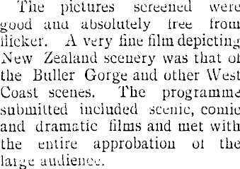 The pictures screened were good ana absolutely tree from dicker. A very line film depicting New Zealand scenery was that ot the Either Gorge and other West Coast scenes. The programme submitted included scenic, comic and dramatic films and met with the entire approbation ol the latge audience.