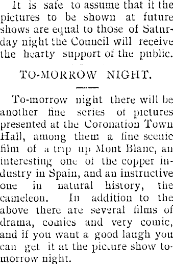 It is safe to assume that it the pictures to be shown at future shows are equal to those of Saturday night the Council will receive the hearty support of the public. TO-MORROW NIG FIT. To-morrow night there will be another fine scries ot pictures presented at the Coronation Town Hall, among them a fine scenic film of a trip up Mont Blanc, an interesting one ot the copper industry in Spain, and an instructive one in natural history, the cameleon. In addition to the above there are several films of drama, comics and very comic, and if you want a good laugh you can get it at the picture show tomorrow night.