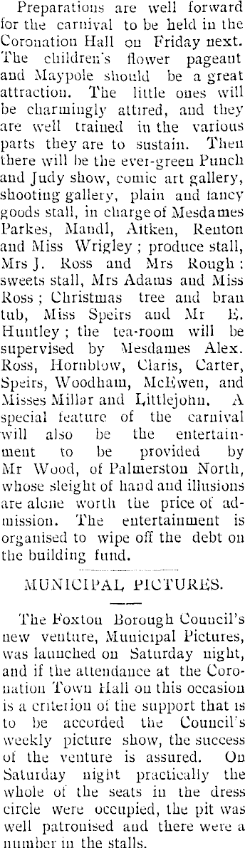 Preparations are well forward for the carnival to be held in the Coronation Hall on Friday next. The children's flower pageant and Maypole should be a great attraction. The little ones will be charmingly attired, and they are well trained in the various parts they are to sustain. Then there will lie the ever-green Punch and Judy show, comic art gallery, shooting gallery, plain and fancy goods stall, in charge of Mesdames Parkes, Maudl, Aitkeu, Renton and Miss Wrigley ; produce stall, Mrs], Ross and Mrs Rough; sweets stall, Mrs Adams and Miss Ross ; Christmas tree and bran tub, Miss Speirs and Mr E. Huntley ; the tea-room will be supervised by Mesdames Alex. Ross, Hornblow, Claris, Carter, Speirs, Woodham, McKwen, and Misses Millar and Littlejohn. A special feature of the carnival will also be the entertainment to be provided by Mr Wood, of Palmerston North, whose sleight of hand and illusions are alone worth the price of admission. The entertainment is organised to wipe oil the debt on the building fund. MUNICIPAL PICTURES. The Foxtou Borough Council’s new venture, Municipal Pictures, was launched on Saturday night, and if the attendance at the Coronation Town Hall on this occasion is a criterion of the support that is to be accorded the Council’s weekly picture show, the success of the venture is assured. On Saturday night practically the whole of the seats in the dress circle were occupied, the pit was well patronised and there were a number in the stalls.