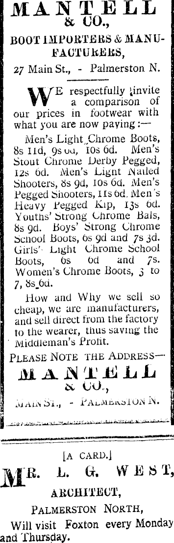 MAN TELL & 00., BOOT IMPOBTEBS & MANUFACTUBEiiS, 27 Main St., - Palmerston N. WE respectfully a comparison of our prices in footwear with what you are now paying Men’s Light, Chrome Boots, 8s nd, 9s ua, los 6d. Men’s Stout Chrome Derby Pegged, I2s 6d. Men’s Light iN ailed Shooters, 8s gd, ios 6d. Men’s Pegged Shooters, I is 6d. Men’s Heavy Pegged Kip, 13s 6d. Youths’Strong Chrome Bals, 8s Qd. Boys’ Strong Chrome School Boots, 6s gd and 7s jd. Girls’' Light Chrome School Boots, 6s 6d and /S. Women’s Chrome Boots, 3 to 7, Bs.6d. How and Why we sell so cheap, we are manufacturers, and sell direct from the factory to the wearer, thus saving the ' Middleman’s Protit. Please Note the Address— M Ahl'X’JU JLli sc GO.. ABCHITEOT, Palmerston North, Will visit Foxton every Monday and Thursday. I [A CARD.] L. aWES %
