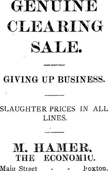 GENUINE CLEARING SALE. GIVING UP BUSINESS. SLAUGHTER PRICES IN ALL LINES. M. HAIEK. THE ECONOMIC. Maiu Street - - Poxton.