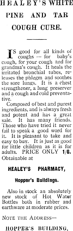 HEALEY’S WHITE PINE AND TAB COUGH CURE. IS good for all kinds of coughs for baby’s cough, for your cough and foxgrandma’s cough. It heals the irritated bronchial tubes, releases the phlegm and soothes the sore lungs. It is a chest strengthener, a lung preserver and a cough and cold preventative. Composed of best and purest ingredients, and is always fresh and potent and has a great sale. It has many friends. Those who have tried it never fail to speak a good word for it. It is pleasant to take and easy to buy. It is just as good for little children as it is for adults. PRICE ONLY 1/8. Obtainable at HEALEY’S PHARMACY, Hopper’s Buildings. Also in stock an absolutely new stock of Hot Water Bottles both in rubber and earthware at moderate prices. Note the Address— HOPPER’S BUILDING,