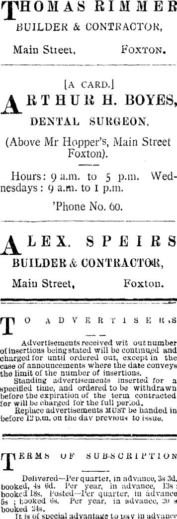 'J'HOMAS RIMMER BUILDER & CONTRACTOR, Main Stieei, Foxton. [a card.J A B T H U R H. BOYES, DENTAL SURGEON. (Above Mr Hopper’s, Main Street Foxton). Hours: 9 a.m. to 5 p.m. Wednesdays ; 9 a.m. to I p.m. ’Phone No. 60. LEX. SPEIRB BUILDER & CONTRACTOR, o ADVERTISE It >s Advertisements received wit outnumber o£ insertions being stated will be continued and charged tor until ordered out, except in the case of announcements where the date conveys the limit of the number of insertions. Standing advertisements inserted for a specified time, and ordered to be withdrawn before the expiration of the term contracted for will be charged for the full period. Replace advertisements MOST be handed in before 111 p.m. on the dav previous to issue. fJIEBMS OF SUR.SOjBH'TION Delivered—l’er quartet, in advance, 3s lid. booked, 4s lid. Per year, in advance, 13s ; booked 18s. Posted—Per quarter, iu advance Bs ; booked lis. Per year, in advance, 3i» » booked 84s. It is of special advantage to pav iu advance Main Street, Foxton,