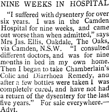 NINE WEEKS IN HOSPITAL “I suffered with dysentery for over six years. I was in the Camden Hospital for nine weeks, and came out worse than when admitted,” says Mrs Jas. Ellis, Oakdale, The Oaks, via Camden, N.S.W. “I consulted different doctors, and was for nine months in bed in my own home. Then I began to take Chamberlain’s Colic and Diarrhoea Remedy, ana after a few bottles were taken I was completely cured, and have not had a return of the dysentery for the last five years,” For sale everywhere. — Advt.